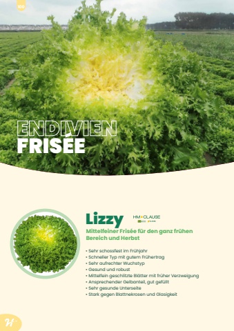 ENDIVIEN FRIS%u00c9ELizzy%u2022 Sehr schossfest im Fr%u00fchjahr %u2022 Schneller Typ mit gutem Fr%u00fchertrag%u2022 Sehr aufrechter Wuchstyp%u2022 Gesund und robust%u2022 Mittelfein geschlitzte Bl%u00e4tter mit fr%u00fcher Verzweigung%u2022 Ansprechender Gelbanteil, gut gef%u00fcllt%u2022 Sehr gesunde Unterseite%u2022 Stark gegen Blattnekrosen und GlasigkeitMittelfeiner Fris%u00e9e f%u00fcr den ganz fr%u00fchen Bereich und Herbst100