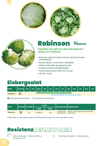 Robinson%u2022 Robuste, mittelschnelle Sorte f%u00fcr die Frischmarktverwendung%u2022 Runde K%u00f6pfe mit sch%u00f6nem Deckblatt%u2022 Glatte Unterseite, gut geschlossen%u2022 Starkes Umblatt, kr%u00e4ftige Bl%u00e4tter%u2022 Gute Innenstruktur, f%u00fcllt nicht zu fest%u2022 HR: Bl 17, 19, Pb Flexibler Eissalat f%u00fcr den Ganzjahresanbau im FreilandEisbergsalatSORTE Z%u00dcCHTER JAN FEB M%u00c4RZ APR MAI JUNI JULI AUG SEPT OKT NOV DEZROBINSONEmpfohlene Pflanzperiode empfohlene ErnteperiodeSORTE Z%u00dcCHTER VOLUMENBLATTVERWENDUNG ANMERKUNGENFARBE FORMROBINSON XXX mittelgr%u00fcn rund Frischmarkt, VerarbeitungSaladin-Typ f%u00fcr den termingerechten SatzanbauErkl%u00e4rungen zu den Abk%u00fcrzungen der Resistenzen finden Sie unten auf dieser Seite.SalatBl Bremia lactucae %u2013 Falscher Mehltau, Bl: Rasse Bl 17, 19Pb Pemphigus bursarius %u2013 SalatwurzellausResistenzDEFINITIONEN104
