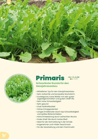 Primaris%u2022 Mittelfeiner Typ f%u00fcr den Ganzjahresanbau%u2022 Sehr aufrechte und kompakte Wuchsform%u2022 Dunkelgr%u00fcne, harte Bl%u00e4tter mit sehr guten Lagereigenschaften und gutem Shelf-life%u2022 Sehr hohe Schossfestigkeit%u2022 Sehr gesund%u2022 Gute Feldhaltbarkeit%u2022 Hohes Ertragspotenzial%u2022 Langes Erntefenster durch top Schossfestigkeit und sp%u00e4tes Bl%u00fctenschieben%u2022 Hohe Ernteleistung durch aufrechten Wuchs%u2022 Gutes Shelf-life durch hartes Blatt%u2022 Ideal f%u00fcr die Vermarktung in der Schale%u2022 Angenehmer und milder Geschmack%u2022 F%u00fcr die Verarbeitung und den FrischmarktSchossfester Rucola f%u00fcr den Ganzjahresanbau106