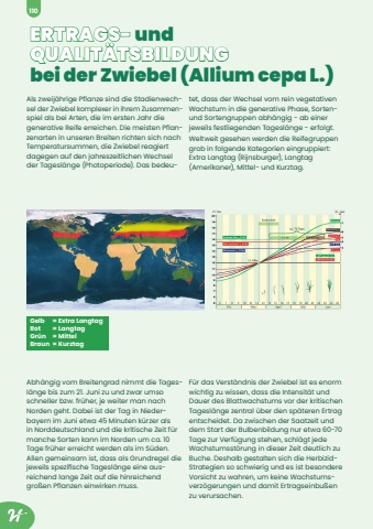 Als zweij%u00e4hrige Pflanze sind die Stadienwechsel der Zwiebel komplexer in ihrem Zusammenspiel als bei Arten, die im ersten Jahr die generative Reife erreichen. Die meisten Pflanzenarten in unseren Breiten richten sich nach Temperatursummen, die Zwiebel reagiert dagegen auf den jahreszeitlichen Wechsel der Tagesl%u00e4nge (Photoperiode). Das bedeutet, dass der Wechsel vom rein vegetativen Wachstum in die generative Phase, Sortenund Sortengruppen abh%u00e4ngig %u2212 ab einer jeweils festliegenden Tagesl%u00e4nge %u2212 erfolgt. Weltweit gesehen werden die Reifegruppen grob in folgende Kategorien eingruppiert: Extra Langtag (Rijnsburger), Langtag (Amerikaner), Mittel- und Kurztag.Abh%u00e4ngig vom Breitengrad nimmt die Tagesl%u00e4nge bis zum 21. Juni zu und zwar umso schneller bzw. fr%u00fcher, je weiter man nach Norden geht. Dabei ist der Tag in Niederbayern im Juni etwa 45 Minuten k%u00fcrzer als in Norddeutschland und die kritische Zeit f%u00fcr manche Sorten kann im Norden um ca. 10 Tage fr%u00fcher erreicht werden als im S%u00fcden. Allen gemeinsam ist, dass als Grundregel die jeweils spezifische Tagesl%u00e4nge eine ausreichend lange Zeit auf die hinreichend gro%u00dfen Pflanzen einwirken muss. F%u00fcr das Verst%u00e4ndnis der Zwiebel ist es enorm wichtig zu wissen, dass die Intensit%u00e4t und Dauer des Blattwachstums vor der kritischen Tagesl%u00e4nge zentral %u00fcber den sp%u00e4teren Ertrag entscheidet. Da zwischen der Saatzeit und dem Start der Bulbenbildung nur etwa 60-70 Tage zur Verf%u00fcgung stehen, schl%u00e4gt jede Wachstumsst%u00f6rung in dieser Zeit deutlich zu Buche. Deshalb gestalten sich die HerbizidStrategien so schwierig und es ist besondere Vorsicht zu wahren, um keine Wachstumsverz%u00f6gerungen und damit Ertragseinbu%u00dfen zu verursachen.ERTRAGS- und QUALIT%u00c4TS BILDUNG bei der Zwiebel (Allium cepa L.)Gelb = Extra LangtagRot = LangtagGr%u00fcn = MittelBraun = Kurztag110