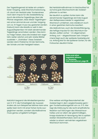 Der Tagesl%u00e4ngenreiz ist leider ein umkehrbarer Vorgang. Jede Wachstumsstockung, z.B. durch ein Herbizid oder Trockenstress nach dem Impuls f%u00fcr die Zwiebelbildung durch die kritische Tagesl%u00e4nge, l%u00e4sst die Pflanze vergessen, dass dieser Tagel%u00e4ngenreiz schon einmal da war und der Vorgang von ca. 14 Tagen muss neu gestartet werden. Dadurch kann die Abreife zu weit in den August/September mit stark abnehmender Tagesl%u00e4nge verschoben werden. Dies kann zur Folge haben, dass die Zwiebel rein vegetativ weiter w%u00e4chst und sehr starke Bl%u00e4tter ausbildet = %u201eDickh%u00e4lse%u201c. Diese Zwiebeln werden dann Probleme mit der Keimruhe, der Schale und der Festigkeit haben. Bei Herbizidma%u00dfnahmen im Nachauflauf ist auf eine gute Wachsschicht der Zwiebelpflanzen zu achten.Bei deutlich zu sp%u00e4ten Sorten kann die abnehmende Tagesl%u00e4nge ab Ende August den Reifeprozess wieder in vegetatives Wachstum umkehren, was wiederum auch in einer gest%u00f6rten Keimruhe resultiert.Alle Ma%u00dfnahmen, auch die Stickstoffd%u00fcngung, die heftige Impulse f%u00fcr das Wachstum bedeuten, sollten vorher %u2013 im allgemeinen Anfang Juni %u2013 abgeschlossen sein. Entsprechend liegt auch der sp%u00e4teste Saatzeitpunkt ca. Anfang Mai f%u00fcr die sp%u00e4teren Sorten, f%u00fcr die Fr%u00fchsorten deutlich fr%u00fcher.Nat%u00fcrlich begrenzt die Mindesttemperatur von 5-6 %u00b0C die Fr%u00fchzeitigkeit der Aussaat. Anders als zum Beispiel bei M%u00f6hren kann eine sp%u00e4te Saat nicht mit einer fr%u00fchen Sorte ausgeglichen werden, sondern die Ma%u00dfnahme muss genau umgekehrt erfolgen.Eine weitere wichtige Besonderheit der Zwiebel liegt in dem vergleichsweise geringen Trockensubtanzgehalt von ca. 11 %. Hier liegt die Erkl%u00e4rung f%u00fcr die recht empfindliche Reaktion auf St%u00f6rungen des Wasserhaushaltes und vor allem der gleichm%u00e4%u00dfigen, knapp dosierten N-Versorgung. Bei zu sp%u00e4ten starken Stickstoffsch%u00fcben, kann es auch wieder zu einem vermehrten vegetativen Wachstum kommen.Onios and other vegetable alliums, J.L. Brewster, Cab International, page 98Leguminosen Kohlgew%u00e4chse Wurzel- und Knollengem%u00fcse Blattgem%u00fcse Chicor%u00e9e Zwiebel- gew%u00e4chse Fruchtgem%u00fcse K%u00fcrbisgew%u00e4chse Zuckermais Informationen111