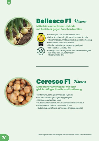 Bellesco F1%u2022 W%u00fcchsiges und sehr robustes Laub%u2022 Feine Schulter mit gl%u00e4nzend brauner Schale%u2022 Gleichm%u00e4%u00dfige, mittelgro%u00dfe bis gro%u00dfe Sortierung%u2022 Formsicher mit fester Schale%u2022 F%u00fcr die mittellange Lagerung geeignet%u2022 HR: Falscher Mehltau (Pd)%u2022 Saatgut aus %u00f6kologischer Produktion verf%u00fcgbar (DE-%u00d6KO-021, Gr%u00fcnstempel%u00ae %u2013 %u00d6kopr%u00fcfstelle e.V.)Mittelfr%u00fche Amerikaner-Hybride mit Resistenz gegen Falschen MehltauCeresco F1%u2022 Mittelfr%u00fche, sehr gleichm%u00e4%u00dfige Hybride%u2022 F%u00fcr die mittellange Lagerung geeignet%u2022 Kr%u00e4ftiges, aufrechtes Laub%u2022 Gutes Wurzelwachstum f%u00fcr optimalen Kulturverlauf%u2022 Mittelbraune Zwiebel mit runder Form%u2022 Gute Schalenhaftung, sehr gutes ErtragspotenzialMittelfr%u00fcher Amerikaner mit sehr gleichm%u00e4%u00dfiger Abreife und SortierungErkl%u00e4rungen zu den Abk%u00fcrzungen der Resistenzen finden Sie auf Seite 126.114