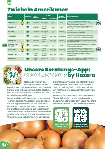 Zwiebeln AmerikanerNEUSORTE Z%u00dcCHTER REIFEGRUPPESCHALE LAGER,F%u00c4HIGKEIT BESCHREIBUNGFARBE FESTIGKEITHAECKERO F1 sehr fr%u00fch braungelb gut langneue, fr%u00fche Hybride mit Resistenz (HR) gegen Falschen Mehltau, auch als biologisch vermehrtes Saatgut erh%u00e4ltlichEURESCO F1 sehr fr%u00fch bronze,braun gut kurz sehr gleichm%u00e4%u00dfige Hybride mit sehr guter Sortierung, besonders fr%u00fche AbreifeSTARTER sehr fr%u00fch braungelb gut mittellang fr%u00fch reifender Amerikaner, gute Kombination aus Ertrag und Fr%u00fchrzeitigkeitPRELESCO F1 mittelfr%u00fch bronze,braun sehr gut mittellang neuer, mittelfr%u00fch abreifender Amerikaner mit hohem Ertragsniveau und guten Qualit%u00e4tenCERESCO F1 mittelfr%u00fch mittel,braun sehr gut mittellang sehr gleichm%u00e4%u00dfig abreifende und gleichm%u00e4%u00dfig sortierende HybrideVIENNESCO F1 (37-136) mittelfr%u00fch braungelb gut lang wuchskr%u00e4ftige, mittelfr%u00fche Neuheit mit Resistenz gegen Falschen MehltauBELLESCO F1 mittelfr%u00fch bronze,braun sehr gut sehr langneuer, sehr w%u00fcchsiger Amerikaner mit Resistenz (HR) gegen Falschen Mehltau, auch als biologisch vermehrtes Saatgut erh%u00e4ltlichMANESCO F1 mittel,sp%u00e4tbronzebraun sehr gut lang starkes Wurzelwerk mit einer sicheren ErtragsbildungTARESCO F1 mittel,sp%u00e4t gelbbraun gut lang Z%u00fcchtung mit sehr hohen Ertr%u00e4gen in gro%u00dfer Sortierung, kr%u00e4ftiges WurzelwerkUnsere Beratungs-App: CROP ADVISOR by HazeraNeben der Vielzahl an hochqualitativen Sorten bietet Hazera mit seinem Team auch gezielte Sorten- und Anbauberatung. Diese Beratung vor Ort ist in unserer DNA verankert und ein Baustein unseres Erfolges.Leider sind die zeitlichen Ressourcen unseres Teams begrenzt. Aus diesem Grunde haben wir uns digital verst%u00e4rkt. Mit der neu %u00fcberarbeiteten %u201eCROP ADVISOR APP%u201c besteht f%u00fcr Sie die M%u00f6glichkeit, digital auf unser Wissen zur%u00fcckzugreifen. Informationen zu Problemen rund um die Zwiebel, Tomate, Kohlarten und Wassermelone stehen Ihnen zur Verf%u00fcgung. Gleichzeitig k%u00f6nnen Sie uns interaktiv Bilder und Fragen senden. Unser Team wird sich dann schnellstm%u00f6glich bei Ihnen melden, um mit Ihnen eine L%u00f6sungsm%u00f6glichkeit zu erarbeiten.Mit den unten stehenden QR-Codes k%u00f6nnen Sie die APP einfach und schnell aus dem Google Play Store oder dem Apple App Store herunterladen und in Ihre Arbeit integrieren.Gehe direkt zu Google PlayGehe direkt zu Apple App Store116