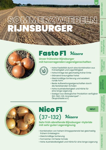 Fasto F1%u2022 Hohe Flexibilit%u00e4t durch eine Kombination aus Fr%u00fchzeitigkeit und Lagerf%u00e4higkeit%u2022 Hohe Ertr%u00e4ge bei gleichzeitig fr%u00fcher Ernte%u2022 Gl%u00e4nzend braungelbe Farbe%u2022 Gleichm%u00e4%u00dfige Sortierung und exzellent runde Form%u2022 Beste Aufbereitungseigenschaften durch die festsitzenden Schalen%u2022 Hohe Austriebsfestigkeit und H%u00e4rte f%u00fcr eine lange Lagerung%u2022 Saatgut aus %u00f6kologischer Produktion verf%u00fcgbar (DE-%u00d6KO-021, Gr%u00fcnstempel%u00ae %u2013 %u00d6kopr%u00fcfstelle e.V.)Unser fr%u00fchester Rijnsburger mit hervorragenden LagereigenschaftenNico F1 (37-132)%u2022 Kombination von hohem Ertragspotenzial bei gleichzeitig fr%u00fchem Erntebeginn%u2022 Gleichm%u00e4%u00dfige Sortierung%u2022 Formsicher mit fester Schale%u2022 Hohe Austriebsfestigkeit und H%u00e4rte f%u00fcr eine lange LagerungSehr fr%u00fch abreifende Rijnsburger-Hybride mit sehr guter LagereignungNEU!SOMMERZWIEBELN RIJNSBURGERLeguminosen Kohlgew%u00e4chse Wurzel- und Knollengem%u00fcse Blattgem%u00fcse Chicor%u00e9e Zwiebel- gew%u00e4chse Fruchtgem%u00fcse K%u00fcrbisgew%u00e4chse Zuckermais Informationen117