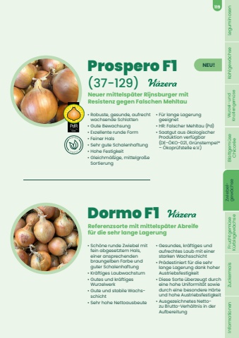 Prospero F1 (37-129)%u2022 Robuste, gesunde, aufrecht wachsende Schlotten%u2022 Gute Bewachsung%u2022 Exzellente runde Form%u2022 Feiner Hals%u2022 Sehr gute Schalenhaftung%u2022 Hohe Festigkeit%u2022 Gleichm%u00e4%u00dfige, mittelgro%u00dfe Sortierung%u2022 F%u00fcr lange Lagerung geeignet%u2022 HR: Falscher Mehltau (Pd)%u2022 Saatgut aus %u00f6kologischer Produktion verf%u00fcgbar (DE-%u00d6KO-021, Gr%u00fcnstempel%u00ae %u2013 %u00d6kopr%u00fcfstelle e.V.)Neuer mittelsp%u00e4ter Rijnsburger mit Resistenz gegen Falschen MehltauNEU!Dormo F1%u2022 Sch%u00f6ne runde Zwiebel mit fein abgesetztem Hals, einer ansprechenden braungelben Farbe und guter Schalenhaftung%u2022 Kr%u00e4ftiges Laubwachstum%u2022 Gutes und kr%u00e4ftiges Wurzelwerk%u2022 Gute und stabile Wachsschicht%u2022 Sehr hohe Nettoausbeute%u2022 Gesundes, kr%u00e4ftiges und aufrechtes Laub mit einer starken Wachsschicht%u2022 Pr%u00e4destiniert f%u00fcr die sehr lange Lagerung dank hoher Austriebsfestigkeit%u2022 Diese Sorte %u00fcberzeugt durch eine hohe Uniformit%u00e4t sowie durch eine besondere H%u00e4rte und hohe Austriebsfestigkeit %u2022 Ausgezeichnetes Nettozu Brutto-Verh%u00e4ltnis in der AufbereitungReferenzsorte mit mittelsp%u00e4ter Abreife f%u00fcr die sehr lange LagerungLeguminosen Kohlgew%u00e4chse Wurzel- und Knollengem%u00fcse Blattgem%u00fcse Chicor%u00e9e Zwiebel- gew%u00e4chse Fruchtgem%u00fcse K%u00fcrbisgew%u00e4chse Zuckermais Informationen119