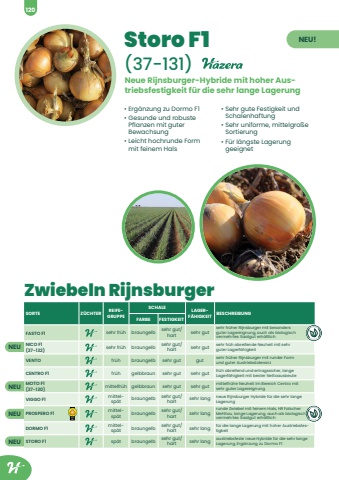 Storo F1 NEU!(37-131)%u2022 Erg%u00e4nzung zu Dormo F1%u2022 Gesunde und robuste Pflanzen mit guter Bewachsung%u2022 Leicht hochrunde Form mit feinem Hals%u2022 Sehr gute Festigkeit und Schalenhaftung%u2022 Sehr uniforme, mittelgro%u00dfe Sortierung%u2022 F%u00fcr l%u00e4ngste Lagerung geeignetNeue Rijnsburger-Hybride mit hoher Austriebsfestigkeit f%u00fcr die sehr lange LagerungZwiebeln RijnsburgerSORTE Z%u00dcCHTER REIFEGRUPPESCHALE LAGER,F%u00c4HIGKEIT BESCHREIBUNGFARBE FESTIGKEITFASTO F1 sehr fr%u00fch braungelb sehr gut/hart sehr gutsehr fr%u00fcher Rijnsburger mit besonders guter Lagereignung, auch als biologisch vermehrtes Saatgut erh%u00e4ltlichNICO F1 (37-132) sehr fr%u00fch braungelb sehr gut/hart sehr gut sehr fr%u00fch abreifende Neuheit mit sehr guter Lagerf%u00e4higkeitVENTO fr%u00fch braungelb sehr gut gut sehr fr%u00fcher Rijnsburger mit runder Form und guter AustriebstoleranzCENTRO F1 fr%u00fch gelbbraun sehr gut sehr gut fr%u00fch abreifend und ertragssicher, lange Lagerf%u00e4higkeit mit bester NettoausbeuteMOTO F1 (37-130) mittelfr%u00fch gelbbraun sehr gut sehr gut mittelfr%u00fche Neuheit im Bereich Centro mit sehr guter LagereignungVIGGO F1 mittelsp%u00e4t braungelb sehr gut/hart sehr lang neue Rijnsburger Hybride f%u00fcr die sehr lange LagerungPROSPERO F1 mittelsp%u00e4t braungelb sehr gut/hart sehr langrunde Zwiebel mit feinem Hals, HR Falscher Mehltau, lange Lagerung, auch als biologisch vermehrtes Saatgut erh%u00e4ltlichDORMO F1 mittelsp%u00e4t braungelb sehr gut/hart sehr lang f%u00fcr die lange Lagerung mit hoher AustriebsfestigkeitSTORO F1 sp%u00e4t braungelb sehr gut/hart sehr lang austriebsfeste neue Hybride f%u00fcr die sehr lange Lagerung, Erg%u00e4nzung zu Dormo F1NEUNEUNEUNEU120