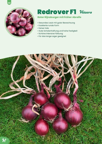 Redrover F1%u2022 Gesundes Laub mit guter Bewachsung%u2022 Exzellente runde Form%u2022 Feiner Hals%u2022 Gute Schalenhaftung und hohe Festigkeit%u2022 Sch%u00f6ne intensive F%u00e4rbung%u2022 F%u00fcr das lange Lager geeignetRoter Rijnsburger mit fr%u00fcher Abreife122