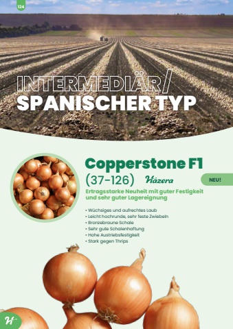 INTERMEDI%u00c4R/ SPANISCHER TYPCopperstone F1 (37-126)%u2022 W%u00fcchsiges und aufrechtes Laub%u2022 Leicht hochrunde, sehr feste Zwiebeln%u2022 Bronzebraune Schale%u2022 Sehr gute Schalenhaftung%u2022 Hohe Austriebsfestigkeit%u2022 Stark gegen ThripsErtragsstarke Neuheit mit guter Festigkeit und sehr guter LagereignungNEU!124