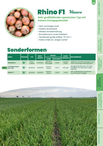 Rhino F1%u2022 Sehr w%u00fcchsiges Laub%u2022 Starkes Wurzelwerk%u2022 Mittlere Schalenhaftung%u2022 Bronzebraune runde Zwiebeln%u2022 Tendenziell gro%u00dfe Kaliber 70 mm +%u2022 Hoher Anteil an %u201eSingle Center%u201cSehr gro%u00dffallender spanischer Typ mit hohem ErtragspotenzialSORTE Z%u00dcCHTER TYP REIFEGRUPPESCHALE LAGER,F%u00c4HIGKEIT BESCHREIBUNGFARBE FESTIGKEITFRANZISCO inter,medi%u00e4r mittelfr%u00fch gl%u00e4nzend braungelb mittel gut bis mittelSelektion mit hohen Ertr%u00e4gen auch unter schwierigen BedingungenCOPPERSTONE F1 (37-126) spanisch mittelfr%u00fch bronzebraun hoch sehr gutertragsstarke Neuheit mit hoher Festigkeit und sehr guter LagereignungRHINO F1 spanisch mittelfr%u00fch bronze,braun mittel mittel sehr gro%u00dffallender spanischer Typ mit hohen Ertr%u00e4genSonderformenNEULeguminosen Kohlgew%u00e4chse Wurzel- und Knollengem%u00fcse Blattgem%u00fcse Chicor%u00e9e Zwiebel- gew%u00e4chse Fruchtgem%u00fcse K%u00fcrbisgew%u00e4chse Zuckermais Informationen125
