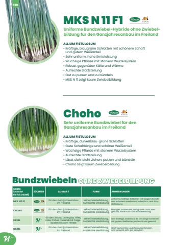 MKS N 11 F1ALLIUM FISTULOSUM%u2022 Kr%u00e4ftige, blaugr%u00fcne Schlotten mit sch%u00f6nem Schaft und gutem Wei%u00dfanteil%u2022 Sehr uniform, hohe Ernteleistung%u2022 W%u00fcchsige Pflanze mit starkem Wurzelsystem%u2022 Robust gegen%u00fcber K%u00e4lte und W%u00e4rme%u2022 Aufrechte Blattstellung%u2022 Gut zu putzen und zu b%u00fcndeln%u2022 MKS N 11 zeigt kaum ZwiebelbildungUniforme Bundzwiebel-Hybride ohne Zwiebelbildung f%u00fcr den Ganzjahresanbau im FreilandChohoALLIUM FISTULOSUM%u2022 Kr%u00e4ftige, dunkelblau-gr%u00fcne Schlotten%u2022 Gute Schaftl%u00e4nge und sch%u00f6ner Wei%u00dfanteil%u2022 W%u00fcchsige Pflanze mit starkem Wurzelsystem%u2022 Aufrechte Blattstellung%u2022 L%u00e4sst sich leicht ziehen, putzen und b%u00fcndeln%u2022 Choho zeigt kaum ZwiebelbildungSehr uniforme Bundzwiebel f%u00fcr den Ganzjahresanbau im FreilandSORTE (ALLIUM FISTULOSUM)Z%u00dcCHTER AUSSAAT FORM ANMERKUNGENMKS N11 F1 f%u00fcr den Ganzjahresanbau im Freilandkeine Zwiebelbildung, nur leichte Verdickunguniforme, kr%u00e4ftige Schlotten mit langem Schaft und sch%u00f6nem Wei%u00dfanteil, hohe Putz- und B%u00fcndelleistungCHOHO f%u00fcr den Ganzjahresanbau im Freilandkeine Zwiebelbildung, nur leichte Verdickungkr%u00e4ftiges, aufrechtes, blaugr%u00fcnes Laub, sehr gesund, hohe Putz- und B%u00fcndelleistungSAVELf%u00fcr den Anbau Unterglas, Vlies/Folie, fr%u00fches Freiland mit Folgesaaten bis zum Herbstkeine Zwiebelbildung, nur leichte Verdickungsehr kr%u00e4ftige, stabile ca. 50 cm lange Schlotten mit gutem Wei%u00dfanteil, aufrecht und gesundCAREL f%u00fcr den Ganzjahresanbau im Freilandkeine Zwiebelbildung, nur leichte Verdickungstraff aufrechtes Laub f%u00fcr gutes B%u00fcndeln, sehr gesund, sehr gut zu putzenBundzwiebeln OHNE ZWIEBELBILDUNG130