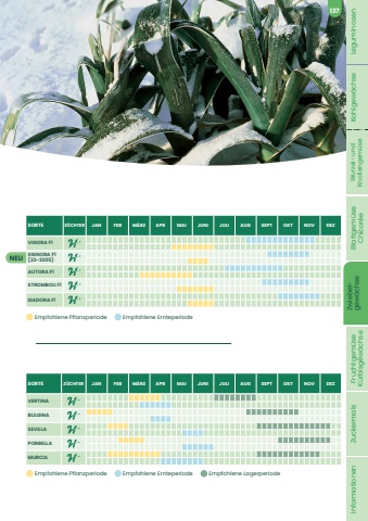 NEUSORTE Z%u00dcCHTER JAN FEB M%u00c4RZ APR MAI JUNI JULI AUG SEPT OKT NOV DEZVIGORA F1SIGNORA F1 (33-3205)AUTORA F1STROMBOLI F1ISADORA F1Empfohlene Pflanzperiode Empfohlene ErnteperiodeSORTE Z%u00dcCHTER JAN FEB M%u00c4RZ APR MAI JUNI JULI AUG SEPT OKT NOV DEZVERTINABULGINASEVILLAPORBELLAMURCIAEmpfohlene Pflanzperiode Empfohlene Ernteperiode Empfohlene LagerperiodeLeguminosen Kohlgew%u00e4chse Wurzel- und Knollengem%u00fcse Blattgem%u00fcse Chicor%u00e9e Zwiebel- gew%u00e4chse Fruchtgem%u00fcse K%u00fcrbisgew%u00e4chse Zuckermais Informationen137