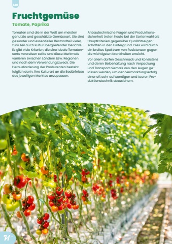 Tomaten sind die in der Welt am meisten genutzte und gesch%u00e4tzte Gem%u00fcseart. Sie sind gesunder und essentieller Bestandteil vieler, zum Teil auch kultur%u00fcbergreifender Gerichte. Es gibt viele Kriterien, die eine ideale Tomatensorte vorweisen sollte und diese Merkmale variieren zwischen L%u00e4ndern bzw. Regionen und nach dem Verwendungszweck. Die Herausforderung der Produzenten besteht folglich darin, ihre Kulturart an die Bed%u00fcrfnisse des jeweiligen Marktes anzupassen. Anbautechnische Fragen und Produktionssicherheit treten heute bei der Sortenwahl als Hauptkriterien gegen%u00fcber Qualit%u00e4tseigenschaften in den Hintergrund. Dies wird durch ein breites Spektrum von Resistenzen gegen die wichtigsten Krankheiten erreicht. Vor allem d%u00fcrfen Geschmack und Konsistenz und deren Beibehaltung nach Verpackung und Transport niemals aus den Augen gelassen werden, um den Vermarktungserfolg einer oft sehr aufwendigen und teuren Produktionstechnik abzusichern. Fruchtgem%u00fcseTomate, Paprika140