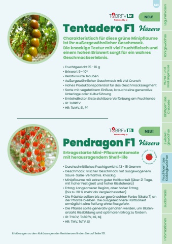 Tentadero F1%u2022 Fruchtgewicht 15 - 16 g%u2022 Brixwert 9 - 10%u00b0%u2022 Relativ kurze Trauben%u2022 Au%u00dfergew%u00f6hnlicher Geschmack mit viel Crunch%u2022 Hohes Produktionspotenzial f%u00fcr das Geschmackssegment %u2022 Sorte mit vegetativem Einfluss, braucht eine generative Unterlage oder Kulturf%u00fchrung%u2022 Ernteindikator: Erste sichtbare Verf%u00e4rbung am Fruchtende%u2022 IR: ToBRFV%u2022 HR: ToMV, Si, PfCharakteristisch f%u00fcr diese gr%u00fcne Minipflaume ist ihr au%u00dfergew%u00f6hnlicher Geschmack. Die knackige Textur mit viel Fruchtfleisch und einem hohen Brixwert sorgt f%u00fcr ein wahres Geschmackserlebnis. NEU!Pendragon F1%u2022 Durchschnittliches Fruchtgewicht: 13 - 15 Gramm %u2022 Geschmack: Frischer Geschmack mit ausgewogenem S%u00e4ure-S%u00fc%u00dfe-Verh%u00e4ltnis. Knackig.%u2022 Minipflaume mit extrem guter Haltbarkeit (%u00fcber 21 Tage, mit hoher Festigkeit und hoher Risstoleranz)%u2022 Ertrag: Langsamerer Beginn, aber hoher Ertrag (bis zu 20 % mehr als Vergleichssorten)%u2022 Die Fr%u00fcchte sollten bis zur gew%u00fcnschten Farbe (Skala 7) an der Pflanze bleiben. Die ausgezeichnete Haltbarkeit erm%u00f6glicht eine Reifung ohne Rissgefahr.%u2022 Die Pflanze sollte generativ gehalten werden, um Bl%u00fctenanzahl, Rissbildung und optimalen Ertrag zu f%u00f6rdern.%u2022 IR: TYLCV, ToBRFV, Mi, Mj%u2022 HR: TMV, ToTV, SiErtragsstarke Mini-Pflaumentomate mit herausragendem Shelf-lifeNEU!Erkl%u00e4rungen zu den Abk%u00fcrzungen der Resistenzen finden Sie auf Seite 151.Leguminosen Kohlgew%u00e4chse Wurzel- und Knollengem%u00fcse Blattgem%u00fcse Chicor%u00e9e Zwiebel- gew%u00e4chse Fruchtgem%u00fcse K%u00fcrbisgew%u00e4chse Zuckermais Informationen143