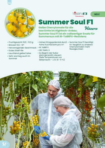 Summer Soul F1%u2022 Fruchtgewicht 10,5%u2006-%u200612,5 g%u2022 Brixwert 9,5 - 10%u00b0%u2022 Hervorragender Geschmack%u2022 Gutes Shelf-life%u2022 Leuchtend gelbe Farbe%u2022 Sehr w%u00fcchsig auch im Sommer%u2022 Hohes Ertragspotenzial durch hohe Fruchtanzahl pro m%u00b2%u2022 IR: ToBRFV%u2022 HR: ToMV, S%u2022 Zu Beginn der Kultur stark generativ steuern (tiefe Temperaturen vor Mitternacht %u2013 z. B. 10 - 11 %u00b0C)%u2022 Summer Soul F1 ben%u00f6tigt im Vergleich zu anderen Cherrytomaten mehr fl%u00fcssiges EisenGelbe Cherrytomate f%u00fcr die lose Ernte im Hightech-Anbau. Summer Soul F1 ist ein vollwertiger Ersatz f%u00fcr Summersun mit IR-ToBRFV-ResistenzNEU! 144