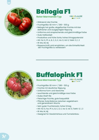 Bellogia F1%u2022 Gl%u00e4nzend rote Fr%u00fcchte %u2022 Fruchtgr%u00f6%u00dfe: 82 mm+ / 260%u2006-%u2006300 g%u2022 Bellogia hat gro%u00dfe, abgeflachte Fr%u00fcchte mit klar definierter und ausgepr%u00e4gter Rippung%u2022 Uniforme und ansprechende und gleichm%u00e4%u00dfige Farbe %u2022 Gute Haltbarkeit%u2022 Produktive und fr%u00fche Sorte, hohes Ertragspotenzial %u2022 HR: Fol: 0, Pf: A, B, C, D, E, Va: 0, Vd: 0, ToMV: 0, 1, 2%u2022 IR: Ma, Mi, Mj%u2022 Rispenschnitt wird empfohlen, um die Einheitlichkeit der Fruchtgr%u00f6%u00dfe zu verbessernRoter Marmande Typ Buffalopink F1%u2022 Fruchtgr%u00f6%u00dfe: 82 mm+ / 280%u2006-%u2006320 g%u2022 Fr%u00fcchte mit deutlicher Rippung%u2022 Uniforme Form und Gewichte%u2022 Leuchtende und gleichm%u00e4%u00dfige rosa Farbe%u2022 Gutes Shelf-life%u2022 Fleischige Fr%u00fcchte, gute Essqualit%u00e4t %u2022 Pflanze: Gute Balance zwischen vegetativem und generativem Wuchs%u2022 Sehr guter Fruchtansatz, hoher Ertrag%u2022 HR: Fol: 0, For, Pf: A, B, C, D, E, Va: 0, Vd: 0, ToMV: 0, 1, 2%u2022 IR: Ma, M, Mj%u2022 Geeignet f%u00fcr Gew%u00e4chshaus und TunnelanbauRosa Marmande Typ 146