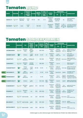 Erkl%u00e4rungen zu den Abk%u00fcrzungen der Resistenzen finden Sie nebenstehend.150 SORTE Z%u00dcCHTER TYPFRUCHTFORM /FRUCHTFARBE%u00d8 IN MMFRUCHTGEWICHT IN GBRIX CA. BEI VOLLREIFEVERWENDUNGRESISTENZENANMERKUNGENHR IRCRISTAL F1 Hellfrucht Mid Liferund rot 57-67 120 3-4Gew%u00e4chshaus, Tunnel, FreilandVd+Va/Fol1,2/ToMV/FfA,B,C,D,ESsrobuste Pflanze, sehr guter GeschmackPAOLINE F1 Lose rund rot - 160-180 -Gew%u00e4chshaus, TunnelFol:0,1; For; PF:A,B,C, D, E; Va:0; Vd:0; ToMV:0,1,2Pi; TSWV:TO; Ma; Mi; Mj; Onw%u00fcchsig, exzellente Resistenzen, guter GeschmackTomaten RUNDSORTE Z%u00dcCHTER TYPFRUCHTFORM /FRUCHTFARBE%u00d8 IN MMFRUCHTGEWICHT IN GBRIX CA. BEI VOLLREIFEVERWENDUNGRESISTENZENANMERKUNGENHR IRGOURMANSUN Ochsen,herzherzf%u00f6rmiggelb- 240-260 -Gew%u00e4chshaus TunnelFol:0,1,2; Va:0; Vd:0; ToMV:0,1,2Pi; TSWV:TOgelbe Fr%u00fcchte, rot geflammt, gutes Shelf-lifeSUMMER SUN F1 Cherry rund gelb 25-30 13-15 10Gew%u00e4chshaus TunnelFol:0,1; ToMV; Vd Mjsehr wohlschmeckende SonderformGIULIETTA F1 San Marzano kr%u00e4ftig rot - 150-180 -Gew%u00e4chshaus TunnelToMV; Vd; Va; Fol 1,2 Ma; Mi; Mjfeste Frucht mit sehr gutem FruchtansatzCORAZON F1 Ochsen,herzrot bei Vollreife - 180-200 -Gew%u00e4chshaus TunnelVd; Va - Reife von innen nach au%u00dfenFLAMANTYNO F1Cherry Tross/Einzelfruchtrund gelb 25-30 13-15 9Gew%u00e4chshaus TunnelToMV; Ff; Fol (0-1); For; Va; VdTYLCV, Mjgelbe Cherrytrosstomate, auch f%u00fcr EinzelfruchternteTENTADERO F1 Mini,pflaume gr%u00fcn - 15-16 9-10Gew%u00e4chshaus TunnelToMV/SI/Pf ToBRFV knackige, gr%u00fcne MinipflaumePENDRAGON F1 Mini,pflaume rot - 13-15 -Gew%u00e4chshaus TunnelTTMV / ToTV / SITYLCV / ToBRFV / Mi / MjMini-Pflaumentomate mit hervorragendem Shelf-lifeSUMMER SOUL F1 Cherry gelb - 10,5-12,5 9,5-10,5Gew%u00e4chshaus TunnelToMV/S ToBRFV gelbe Cherrytomate f%u00fcr die lose ErnteFLAMANSUN F1 Ochsen,herz gelbrot 67+ 220-260 -Gew%u00e4chshaus TunnelFol:0; For; Pf:A,B,C,D,E; Va:0; Vd:0; ToMV:0,1,2On; TSWV:T0gelbrote OchsenherztomateDOSSIMO F1 Ochsen,herz rot 82+ 240-280 -Gew%u00e4chshaus TunnelFol:0; For; Pf:A,B,C,D,E; Va:0; Vd:0; ToMV:0,1,2On; TSWV:T0l%u00e4mgliche rote OchsenherztomateBELLOGIA F1 Marmande rot 82+ 260-300 -Gew%u00e4chshaus TunnelFol:0; Pf A,B,C,D,E; Va:0; Vd:0; ToMV:0,1,2Ma; Mi; Mj roter Marmande-TypBELLOSUN F1 Marmande gelb 82+ 300-360 -Gew%u00e4chshaus TunnelFol:0,1; For; Pf:A,B,C,D,E; Va:0,Vd:0; ToMV:0,1,2TSWV:T0 gelber Marmande-TypBUFFALOPINK F1 Marmande rosa 82+ 280-320 -Gew%u00e4chshaus TunnelFol:0; For; Pf:A,B,C,D,E; Va:0; Vd:0; ToMV:0,1,2Ma; Mi; Mj rosa Marmande-TypNEUNEUNEUTomaten SONDERFORMEN