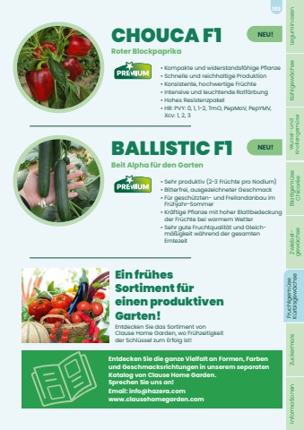 Entdecken Sie die ganze Vielfalt an Formen, Farben und Geschmacksrichtungen in unserem separaten Katalog von Clause Home Garden. Sprechen Sie uns an!Email: info@hazera.comwww.clausehomegarden.comCHOUCA F1 %u2022 Kompakte und widerstandsf%u00e4hige Pflanze %u2022 Schnelle und reichhaltige Produktion %u2022 Konsistente, hochwertige Fr%u00fcchte %u2022 Intensive und leuchtende Rotf%u00e4rbung %u2022 Hohes Resistenzpaket %u2022 HR: PVY: 0, 1, 1-2, TmO, PepMoV, PepYMV, Xcv: 1, 2, 3Roter BlockpaprikaNEU!BALLISTIC F1 %u2022 Sehr produktiv (2-3 Fr%u00fcchte pro Nodium)%u2022 Bitterfrei, ausgezeichneter Geschmack%u2022 F%u00fcr gesch%u00fctzten- und Freilandanbau im Fr%u00fchjahr-Sommer%u2022 Kr%u00e4ftige Pflanze mit hoher Blattbedeckung der Fr%u00fcchte bei warmem Wetter%u2022 Sehr gute Fruchtqualit%u00e4t und Gleich- m%u00e4%u00dfigkeit w%u00e4hrend der gesamten ErntezeitBeit Alpha f%u00fcr den GartenNEU!Entdecken Sie das Sortiment von Clause Home Garden, wo Fr%u00fchzeitigkeit der Schl%u00fcssel zum Erfolg ist! Ein fr%u00fches Sortiment f%u00fcr einen produktiven Garten!Leguminosen Kohlgew%u00e4chse Wurzel- und Knollengem%u00fcse Blattgem%u00fcse Chicor%u00e9e Zwiebel- gew%u00e4chse Fruchtgem%u00fcse K%u00fcrbisgew%u00e4chse Zuckermais Informationen153