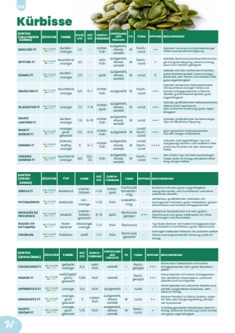 164 SORTEN (HALLOWEENK%u00dcRBIS)Z%u00dcCHTER FARBE %u00d8 KG/STKKG/ STKDURCHF%u00c4RBUNGVERTEILUNG DER FR%u00dcCHTEPX FORM RIPPUNG BESCHREIBUNGMISCHIEF F1 dunkel,orange 1,2 - mittel,fr%u00fchaufgereiht, etwas verteiltIR hoch,rund ++ Hybride, hochrund mit dunkeloranger Farbe und deutlicher RippungSPITFIRE F1 leuchtend orange 2,2 - sehr fr%u00fchaufgereiht, etwas verteiltIR flach,rund +Hybride, flachrund und leuchtend orange mit guter Rippung, stark im Ertrag, auch zum Verzehr geeignetGOMEZ F1 dunkel,orange 2,3 - sp%u00e4taufgereiht,etwas verteiltIR rund 0Hybride mit sehr uniformen Fr%u00fcchten, gutes Resistenzpaket, hohes Ertragspotenzial, sehr harter und stabiler Stiel, gute Lagerf%u00e4higkeitMAGICIAN F1 leuchtend orange 5,9 5-7 mittel,fr%u00fch aufgereiht IR hochrund +++Hybride, attraktiver Halloweenk%u00fcrbis mit leuchtend oranger Farbe und hohem Ertragspotenzial, uniforme Abreife, gutes Resistenzpaket, gute Lagerf%u00e4higkeitGLADIATOR F1 orange 7,3 7-8 mittel,sp%u00e4taufgereiht, etwas verteiltIR rund +++Hybride, gro%u00dffallender Halloweenk%u00fcrbis, determiniert wachsend, sehr uniforme Sortierung, gute Lagerf%u00e4higkeitMAGIC LANTERN F1dunkelorange 7,9 6-10 mittel,fr%u00fchaufgereiht,etwas verteiltIR rund +++ Hybride, gro%u00dffallender dunkeloranger Typ mit deutlicher RippungWARTY GOBLIN F1orange, gr%u00fcn gewarzt5,2 4-6 mittel,fr%u00fch aufgereiht IRrund/hochrund+++ gr%u00fcn gewarzter Halloweenk%u00fcrbis mit sehr langer HaltbarkeitHERMES F1intensiv, kr%u00e4ftig orange6 5-7 mittel,fr%u00fchaufgereiht, etwas verteiltIRrund/flachrund++++robuster und lagerf%u00e4higer Typ mit ausgepr%u00e4gt dickem und stabilem Stiel, uniforme Fr%u00fcchte mit sehr intensiver FarbeORANGE SUNRISE F1leuchtend orange 6,5 5,5-7,5 fr%u00fchaufgereiht, etwas verteiltIR hoch,rund +++sehr fr%u00fcher Typ mit fast neonoranger Farbe, stark im Ertrag, attraktiver Blickfang, lange haltbarSORTEN (SPEISEK%u00dcRBIS)Z%u00dcCHTER TYP FARBE KG/ STKDURCHF%u00c4RBUNG FORM RIPPUNG BESCHREIBUNGSIBELLE F1 Butternut creme,farben 1-1,5 mittel,sp%u00e4thochrund, birnenf%u00f6rmig-Butternut mit sehr guter Lagerf%u00e4higkeit, wenig Kernanteil, viel Fruchtfleisch und einer uniformen AbreifePOTIMARRON Hokkaido rot,orange 1-1,5 fr%u00fch kreiself%u00f6r,mig-attraktiver, gro%u00dffallender Hokkaido mit homogenen Fr%u00fcchten, guter Haltbarkeit, gutem Geschmack und hohem ErtragspotenzialMUSQU%u00c9E DE PROVENCE Muskatcremefarben, gr%u00fcnlich8-12 sp%u00e4t flachrund, gerippt +++attraktiver Muskatk%u00fcrbis mit sehr gutem Geschmack und guter Haltbarkeit, f%u00fcr fr%u00fche Pflanzungen und AussaatenROUGE VIF D'ETAMPESRoter Zentnerrotorange, orange7-11 fr%u00fch flachrund - Typ Roter Zentner mit hohem Ertragspotenzial und dunklem Fruchtfleisch, guter GeschmackCROBLAN Patisson wei%u00df 1-2 fr%u00fch flachrund, gezackt-homogen fallender Patisson mit sch%u00f6ner wei%u00dfer Farbe und ansprechender Zackung, stark im ErtragSORTEN (DEKOK%u00dcRBIS) Z%u00dcCHTER FARBE KG/ STKDURCHF%u00c4RBUNGVERTEILUNG DER FR%u00dcCHTEPX FORM RIPPUNG BESCHREIBUNGCRUNCHKIN F1 gefleckt orange 0,4 sehr fr%u00fch verteilt - flach, gerippt +++fr%u00fcher Mini-Dekok%u00fcrbis mit hohem Ertragspotential, sehr gutes ResistenzpaketKEMON F1wei%u00df/gelb/gr%u00fcn/gestreift0,55 fr%u00fch verteilt - flach, gerippt +++fr%u00fche Hybride mit hohem Ertragspotential, attraktive Pr%u00e4sentation, uniforme Abreife und Fruchtgr%u00f6%u00dfeAPPRENTICE F1 orange 0,4 fr%u00fch aufgereiht - rund -fr%u00fche Hybride mit uniformer Abreife und perfekt aufgereihten K%u00fcrbissen, sehr stark im ErtragMINIWARTS F1orange, gr%u00fcn gewarzt2 mittel,fr%u00fchaufgereiht, etwas verteiltIR rund ++kleines Pendant zu Warty Goblim, stabiler Stiel, sehr lange lagerf%u00e4hig, attraktiver EyecatcherWARTY GNOME F1orange, gr%u00fcn gewarzt1,75 fr%u00fchaufgereiht, etwas verteiltIR flach,rund +3-farbig gewarzter Dekok%u00fcrbis, stark im Ertrag, uniforme Sortierung, harte Schale mit guter Lagerf%u00e4higkeitK%u00fcrbisse