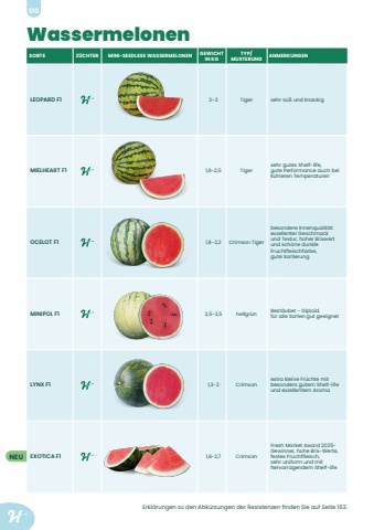 170 Erkl%u00e4rungen zu den Abk%u00fcrzungen der Resistenzen finden Sie auf Seite 163.SORTE Z%u00dcCHTER MINI-SEEDLESS WASSERMELONEN GEWICHT IN KGTYP/ MUSTERUNG ANMERKUNGENLEOPARD F1 2-3 Tiger sehr s%u00fc%u00df und knackigMIELHEART F1 1,8-2,5 Tigersehr gutes Shelf-life, gute Performance auch bei k%u00fchleren TemperaturenOCELOT F1 1,8-2,2 Crimson Tigerbesondere Innenqualit%u00e4t: exzellenter Geschmack und Textur, hoher Brixwert und sch%u00f6ne dunkle Fruchtfleischfarbe, gute SortierungMINIPOL F1 2,5-3,5 hellgr%u00fcn Best%u00e4uber - Diploid, f%u00fcr alle Sorten gut geeignetLYNX F1 1,3-2 Crimsonextra kleine Fr%u00fcchte mit besonders gutem Shelf-life und exzellentem AromaEXOTICA F1 1,8-2,7 CrimsonFresh Market Award 2025Gewinner, hohe Brix-Werte, festes Fruchtfleisch, sehr uniform und mit hervorragendem Shelf-lifeWassermelonenNEU