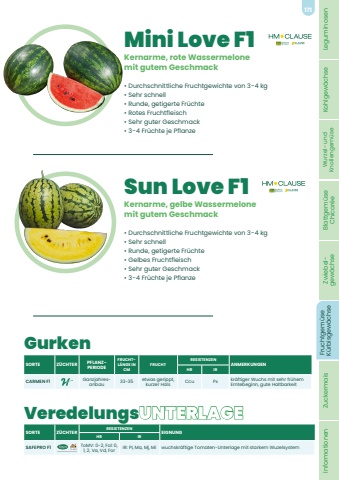 Mini Love F1%u2022 Durchschnittliche Fruchtgewichte von 3%u200a-%u200a4 kg%u2022 Sehr schnell%u2022 Runde, getigerte Fr%u00fcchte%u2022 Rotes Fruchtfleisch%u2022 Sehr guter Geschmack%u2022 3%u200a-%u200a4 Fr%u00fcchte je PflanzeKernarme, rote Wassermelone mit gutem GeschmackSun Love F1%u2022 Durchschnittliche Fruchtgewichte von 3%u200a-%u200a4 kg%u2022 Sehr schnell%u2022 Runde, getigerte Fr%u00fcchte%u2022 Gelbes Fruchtfleisch%u2022 Sehr guter Geschmack%u2022 3%u200a-%u200a4 Fr%u00fcchte je PflanzeKernarme, gelbe Wassermelone mit gutem GeschmackLeguminosen Kohlgew%u00e4chse Wurzel- und Knollengem%u00fcse Blattgem%u00fcse Chicor%u00e9e Zwiebel- gew%u00e4chse Fruchtgem%u00fcse K%u00fcrbisgew%u00e4chse Zuckermais Informationen171SORTE Z%u00dcCHTER PFLANZPERIODEFRUCHTL%u00c4NGE IN CMFRUCHTRESISTENZENANMERKUNGENHR IRCARMEN F1 Ganzjahresanbau 33-35 etwas gerippt, kurzer Hals Ccu Px kr%u00e4ftiger Wuchs mit sehr fr%u00fchem Erntebeginn, gute HaltbarkeitGurkenSORTE Z%u00dcCHTER RESISTENZENEIGNUNGHR IRSAFEPRO F1 ToMV: 0-2, Fol: 0, 1, 2, Va, Vd, For IR: PI, Ma, Mj, Mi wuchskr%u00e4ftige Tomaten-Unterlage mit starkem WuzelsystemVeredelungsUNTERLAGE