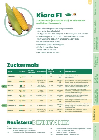 Kiara F1%u2022 Robuste und gesunde Ganzjahressorte%u2022 Sehr gute Standfestigkeit%u2022 Gut gesch%u00fctzte Kolbenspitze mit dunkelgr%u00fcnen Lieschen%u2022 Kolbenl%u00e4nge ca. 20 - 22 cm, Durchmesser ca. 5 cm%u2022 Sehr uniforme Kolben in ansprechender Farbe%u2022 Guter Geschmack, saftig%u2022 Bruchfest, gute Kornfestigkeit%u2022 Einfach zu entlieschen%u2022 Hohe Nettoausbeute%u2022 HR: MDMV, Ps; IR: Pst, UmZuckermais (extras%u00fc%u00df sh2) f%u00fcr die Handund MaschinenernteZuckermaisMDMV Maize dwarf mosaic virus %u2013 MaisverzwergungsmosaikvirusPst Pantoea stewartii ssp. stewartii %u2013 MaiswelkeEt Exserohilum turcicum (ex Setosphaeria turcica) %u2013 Turcicum BlattfleckenPs Puccinia sorghi %u2013 MaisrostUm Ustilago maydis %u2013 BeulenbrandResistenzDEFINITIONENZuckermaisSORTE Z%u00dcCHTER WACHSTUMSTAGE RESISTENZENKOLBENL%u00c4NGE IN CMTYP ANMERKUNGENTURBINE F1 75 %u2013 20 extras%u00fc%u00df sh2schnelle Sorte f%u00fcr die VerarbeitungKIARA F1 77 HR: MDMV, Ps; IR: Pst, Um 20-22 extras%u00fc%u00df sh2mittelschnelle, robuste Ganzjahressorte f%u00fcr die Hand- und MaschinenernteKOPA F1 78 HR: PS, IR: MDMV, Et, Um 21-24 extras%u00fc%u00df sh2Sorte f%u00fcr die Verarbeitung mit gut gef%u00fcllten Kolben, hohe NettoausbeuteAIRLIE F1 79 IR: Et, Ps (Rp1-I) 20-21 extras%u00fc%u00df sh2Frischmarktsorte mit gutem Geschmack, hoher Trockenstressresistenz und stabiler Kolbenl%u00e4ngeMINT F1 80 IR: MDMV, Et, Ps 20 extras%u00fc%u00df sh2robuste Sorte f%u00fcr die Verarbeitung mit hoher NettoausbeuteCANDICE F1 81 IR: Et 20 extras%u00fc%u00df sh2herausragender Geschmack und besondere Essqualit%u00e4tSUREGOLD F1 82 IR: MDMV / Ps 20-22 extras%u00fc%u00df sh2Sorte f%u00fcr den Frischmarkt und die Verarbeitung, gute Kolbenf%u00fcllung, guter LieschenschutzKINZE F1 84 HR: MDMV, Ps; IR: Pst, Um 18-20 extras%u00fc%u00df sh2sp%u00e4te Sorte mit uniformen Kolben und hoher NettoausbeuteNEUNEULeguminosen Kohlgew%u00e4chse Wurzel- und Knollengem%u00fcse Blattgem%u00fcse Chicor%u00e9e Zwiebel- gew%u00e4chse Fruchtgem%u00fcse K%u00fcrbisgew%u00e4chse Zuckermais Informationen175