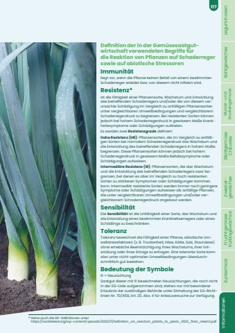 Definition der in der Gem%u00fcsesaatgutwirtschaft verwendeten Begriffe f%u00fcr die Reaktion von Pflanzen auf Schaderreger sowie auf abiotische StressorenImmunit%u00e4tliegt vor, wenn die Pflanze keinen Befall von einem bestimmten Schaderreger erleidet bzw. von diesem nicht infiziert wird.Resistenz*ist die F%u00e4higkeit einer Pflanzensorte, Wachstum und Entwicklung des betreffenden Schaderregers und/oder die von diesem verursachte Sch%u00e4digung im Vergleich zu anf%u00e4lligen Pflanzensorten unter vergleichbaren Umweltbedingungen und vergleichbarem Schaderregerdruck zu begrenzen. Bei resistenten Sorten k%u00f6nnen jedoch bei hohem Schaderregerdruck in gewissem Ma%u00dfe Krankheitssymptome oder Sch%u00e4digungen auftreten.Es werden zwei Resistenzgrade definiert:Hohe Resistenz (HR): Pflanzensorten, die im Vergleich zu anf%u00e4lligen Sorten bei normalem Schaderregerdruck das Wachstum und die Entwicklung des betreffenden Schaderregers in hohem Ma%u00dfe begrenzen. Diese Pflanzensorten k%u00f6nnen jedoch bei hohem Schaderregerdruck in gewissem Ma%u00dfe Befallssymptome oder Sch%u00e4digungen aufweisen.Intermedi%u00e4re Resistenz (IR): Pflanzensorten, die das Wachstum und die Entwicklung des betreffenden Schaderregers zwar begrenzen, bei denen es aber im Vergleich zu hoch resistenten Sorten zu st%u00e4rkeren Symptomen oder Sch%u00e4digungen kommen kann. Intermedi%u00e4r resistente Sorten werden immer noch geringere Symptome oder Sch%u00e4digungen aufweisen als anf%u00e4llige Pflanzen, die unter vergleichbaren Umweltbedingungen und/oder vergleichbarem Schaderregerdruck angebaut werden.Sensibilit%u00e4tDie Sensibilit%u00e4t ist die Unf%u00e4higkeit einer Sorte, das Wachstum und die Entwicklung eines bestimmten Krankheitserregers oder eines Sch%u00e4dlings zu beschr%u00e4nken.ToleranzToleranz bezeichnet die F%u00e4higkeit einer Pflanze, abiotische Umweltstressfaktoren (z. B. Trockenheit, Hitze, K%u00e4lte, Salz, Staun%u00e4sse) ohne erhebliche Beeintr%u00e4chtigung ihres Wachstums, ihrer Entwicklung oder ihres Ertrags zu ertragen. Eine tolerante Sorte kann also unter nicht-optimalen Umweltbedingungen %u00fcberdurchschnittlich gut bestehen.Bedeutung der Symbole %u2117 = Neuz%u00fcchtungSaatgut dieser mit %u2117 bezeichneten Neuz%u00fcchtungen, die noch nicht in der EG-Liste aufgenommen sind, stehen nur mit besonderer Erlaubnis der zust%u00e4ndigen Beh%u00f6rde unter Einhaltung der EG-Richtlinien Nr. 70/458, Art. 20, Abs. 4 f%u00fcr Anbauversuche zur Verf%u00fcgung.* Siehe auch die ISF-Definitionen unter https://worldseed.org/wp-content/uploads/2022/11/Definition_on_reaction_plants_to_pests_2022_final_clean2.pdfLeguminosen Kohlgew%u00e4chse Wurzel- und Knollengem%u00fcse Blattgem%u00fcse Chicor%u00e9e Zwiebel- gew%u00e4chse Fruchtgem%u00fcse K%u00fcrbisgew%u00e4chse Zuckermais Informationen177