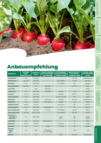 AnbauempfehlungGEM%u00dcSEARTTAUSENDKORN%u00adGEWICHT IN GKORNZAHL PRO GSAATGUTBEDARF PRO HA BEI DIREKTSAAT IN KORN%u00d8 PFLANZENBEDARF PRO HA/M%u00b2 JUNGPFLANZENDURCHSCHNITTLICHE KULTUR%u00adDAUER IN TAGENPFLANZ- ODER SAATABST%u00c4NDE IN CMAUBERGINEN 4-6 150-200 - 120-180 2 Pflanzen/m%u00b2BLUMENKOHL 3,0-3,5 280-330 - 30-33.000 70-80 62,5x50BROKKOLI 3-4 250-330 - 33-38.000 65 62,5x50BUSCHBOHNEN 180-350 3-6 300.000 - 70-75 45x8CHICOR%u00c9E 2 600 250.000 - - 50x12CHINAKOHL 3-4 250-330 200.000 50.000 60 50x30EISSALAT 1,1-1,8 550-900 - 80.000 50-70 50x30ENDIVIE/FRIS%u00c9E 1,2-1,6 625-830 - 60.000-90.000 100 40x30FELDSALAT 1,1-3 330-900 6.400.000 85-100 50-90 10x9 Pflanz.GR%u00dcNKOHL 2-3 330-5 700-800 g 35.000 210 50x50GURKEN (GLAS) 25-35 30-40 - 1,5-2,5/m%u00b2 80 150-30BUNDZWIEBELN 5-10 200-333 6 Einheiten - 90 25x2,5KNOLLENFENCHEL 4-6 160-250 2-3 kg 90-110.000 60-75 35x25KNOLLENSELLERIE 0,35-0,5 2.000-2.850 - 55-68.000 120-140 50x40KOPFSALAT- UNTERGLAS- FREILAND1-1,2 830-1.000 --18/m%u00b210/m%u00b21005025x2530x30MAIR%u00dcBEN 3-4 250-330 550 g/100 m%u00b2 - 60 30x10MANGOLD 15-20 50-60 - 40.000 70 40x25MELONEN 35 30 10.000 7-10.000 80 100x100M%u00d6HREN- FR%u00dcH- SP%u00c4T1,2 830 1.000.0001.6 - 2.200.000- 125 2-4PAPRIKA 7 140 - 5/m%u00b2 120-180 50x50x100Leguminosen Kohlgew%u00e4chse Wurzel- und Knollengem%u00fcse Blattgem%u00fcse Chicor%u00e9e Zwiebel- gew%u00e4chse Fruchtgem%u00fcse K%u00fcrbisgew%u00e4chse Zuckermais Informationen179