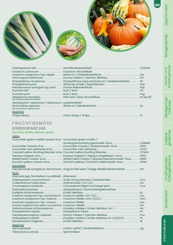Cladosporium allii. . . . . . . . . . . . . . . . . . . . . . Samtfleckenkrankheit. . . . . . . . . . . . . . . . . . . . . . . . . . . . . . . . . . . . . . CLADACFusarium culmorum. . . . . . . . . . . . . . . . . . . Fusarium-Wurzelf%u00e4uleFusarium oxysporum f.sp. cepae . . . . . . Basal rot / Zwiebelbasalf%u00e4ule. . . . . . . . . . . . . . . . . . . . . . . . . . . . . . . Foc Peronospora destructor . . . . . . . . . . . . . . . Downy mildew / Falscher Mehltau. . . . . . . . . . . . . . . . . . . . . . . . . . Pd Phytophthora nicotianae . . . . . . . . . . . . . . Phytophthora neck and bulb rot / Zwiebelhalsf%u00e4ule. . . . . . . . . Pn Phytophthora porri . . . . . . . . . . . . . . . . . . . . White tip of leek / Papierflecken. . . . . . . . . . . . . . . . . . . . . . . . . . . . . Php Pseudomonas syringae f.sp. porri. . . . . . Porree-Bakterienf%u00e4ule. . . . . . . . . . . . . . . . . . . . . . . . . . . . . . . . . . . . . . . PspPuccinia allii . . . . . . . . . . . . . . . . . . . . . . . . . . . Rust / Rost. . . . . . . . . . . . . . . . . . . . . . . . . . . . . . . . . . . . . . . . . . . . . . . . . . Pa Puccinia porri. . . . . . . . . . . . . . . . . . . . . . . . . . Rust / Rost. . . . . . . . . . . . . . . . . . . . . . . . . . . . . . . . . . . . . . . . . . . . . . . . . . Pup Setophoma terrestris. . . . . . . . . . . . . . . . . . Pink root / Rosa Wurzelf%u00e4ule. . . . . . . . . . . . . . . . . . . . . . . . . . . . . . . . . St (ex Pt) (ex Pyrenochaeta terrestris)Stemphylium vesicarium / botryosum. LaubkrankheitStromatinia cepivora . . . . . . . . . . . . . . . . . . White rot / Mehlkrankheit. . . . . . . . . . . . . . . . . . . . . . . . . . . . . . . . . . . Sc(ex Sclerotium cepivorum)INSEKTENThrips tabaci . . . . . . . . . . . . . . . . . . . . . . . . . . Onion thrips / Thrips. . . . . . . . . . . . . . . . . . . . . . . . . . . . . . . . . . . . . . . . Tt FRUCHTGEM%u00dcSEK%u00dcRBISGEW%u00c4CHSEZucchini, K%u00fcrbis, Melone, GurkeVIRENCucumber green mottle mosaic virus Cucumber green mottle / Gurkengr%u00fcnscheckungsmosaik-Virus. . . . . . . . . . . . . . . . . . . . . . . CGMMVCucumber mosaic virus. . . . . . . . . . . . . . . Cucumber mosaic / Gurkenmosaik-Virus. . . . . . . . . . . . . . . . . . CMVCucumber vein yellowing virus. . . . . . . . . Cucumber vein yellowing. . . . . . . . . . . . . . . . . . . . . . . . . . . . . . . . . . . CVYVCucurbit yellow stunting disorder virus Cucurbit yellow stunting disorder. . . . . . . . . . . . . . . . . . . . . . . . . . . CYSDVPapaya ringspot virus. . . . . . . . . . . . . . . . . . Papaya ringspot / Papaya-Ringflecken-Virus. . . . . . . . . . . . . . . PRSVWatermelon mosaic virus. . . . . . . . . . . . . . Watermelon mosaic / Wassermelonenmosaik-Virus. . . . . . . WMVZucchini yellow mosaic virus. . . . . . . . . . . Zucchini yellows / Zucchini-Gelbmosaik-Virus. . . . . . . . . . . . . . ZYMVBAKTERIENPseudomonas syringae pv. lachrymans. . Angular leaf spot / Eckige Blattfleckenkrankheit. . . . . . . . . . . . PslPILZE Alternaria app. (Ulocladium cucurbitae). . AlternariaCladosporium cucumerinum. . . . . . . . . . Scab and gummosis / Gurkenkr%u00e4tze. . . . . . . . . . . . . . . . . . . . . . . . CcuColletotrichum orbiculare. . . . . . . . . . . . . . Anthracnose / Co: 1,2,3. . . . . . . . . . . . . . . . . . . . . . . . . . . . . . . . . . . . . . CoCorynespora cassiicola. . . . . . . . . . . . . . . . Corynespora blight and target spot. . . . . . . . . . . . . . . . . . . . . . . . CcaDidymella bryoniae. . . . . . . . . . . . . . . . . . . . St%u00e4ngelbrand / Gummist%u00e4ngelkrankheitErysiphe chicoracearum. . . . . . . . . . . . . . . Echter Mehltau. . . . . . . . . . . . . . . . . . . . . . . . . . . . . . . . . . . . . . . . . . . . . . EcFusarium oxysporum f.sp. cucumerinum. Fusarium Welke; Foc: 1,2,3. . . . . . . . . . . . . . . . . . . . . . . . . . . . . . . . . . . FocFusarium oxysporum f.sp. melonis. . . . . Fusarium Welke; Fom: 0,1,2,1.2. . . . . . . . . . . . . . . . . . . . . . . . . . . . . . . FomFusarium oxysporum f.sp. niveum. . . . . . Fusarium Welke. . . . . . . . . . . . . . . . . . . . . . . . . . . . . . . . . . . . . . . . . . . . . FonFusarium oxysporum f.sp. radicis-cucumerinum. Fusarium-Welke. . . . . . . . . . . . . . . . . . . . . . . . . . . . . . . . . . . . . . . . . . . . ForGolovinomyces cichoracearum . . . . . . . Powdery mildew / Echter Mehltau; Gc: 1. . . . . . . . . . . . . . . . . . . . . GcPhytophthora capsici. . . . . . . . . . . . . . . . . . Phytopthora-F%u00e4ule. . . . . . . . . . . . . . . . . . . . . . . . . . . . . . . . . . . . . . . . . . PcPseudoperonospora cubensis. . . . . . . . . Downy mildew / Falscher Mehltau. . . . . . . . . . . . . . . . . . . . . . . . . . Pcu Podosphaera xanthii . . . . . . . . . . . . . . . . . . Powdery mildew / Echter Mehltau; Px: 1,2,3,5,3.5. . . . . . . . . . . . . PxSphaerotheca fuliginea. . . . . . . . . . . . . . . . Echter Mehltau. . . . . . . . . . . . . . . . . . . . . . . . . . . . . . . . . . . . . . . . . . . . . . SfINSEKTENAphis gossypii. . . . . . . . . . . . . . . . . . . . . . . . . . Cotton aphid / Gurkenblattlaus. . . . . . . . . . . . . . . . . . . . . . . . . . . . . AgTetranychus urticae. . . . . . . . . . . . . . . . . . . . SpinnmilbenLeguminosen Kohlgew%u00e4chse Wurzel- und Knollengem%u00fcse Blattgem%u00fcse Chicor%u00e9e Zwiebel- gew%u00e4chse Fruchtgem%u00fcse K%u00fcrbisgew%u00e4chse Zuckermais Informationen183