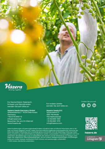 Diese Empfehlungen und jede erg%u00e4nzende/andere m%u00fcndliche oder schriftliche Information, die im Namen von Hazera gegeben werden, stellen durchschnittliche Ergebnisse sortenspezifischer Versuche dar. Diese sind weder vollst%u00e4ndig noch unbedingt genau und k%u00f6nnen nicht als Ratschlag, Anleitung, Empfehlung, Zusicherung oder Gew%u00e4hrleistung angesehen werden. Aussaatzeiten und Anbaugebiete sind nicht verbindlich. Die Abbildungen sind nur beispielhaft. Der Verkauf und die Verwendung von Saatgut unterliegen den Allgemeinen Gesch%u00e4ftsbedingungen, die auf unseren Saatgutverpackungen und Katalogen sowie auf unserer Website ver%u00f6ffentlicht sind. Irrt%u00fcmer und Auslassungen vorbehalten.%u00a9 2025 Hazera. Alle Rechte vorbehalten.hazera.deFinden Sie uns aufHazera Seeds Germany GmbHGriewenkamp 2 %u00b7 31234 EdemissenGermany+49.5176.9891-12info@hazera.deBesuchen Sie uns im Internet:www.hazera.deHazera Seeds B.V.Schanseind 274921 PM MadeThe Netherlands+31.162.690-900+31.162.680-970 info@hazera.comF%u00fcr Deutschland, %u00d6sterreich, Schweiz und Skandinavien wenden Sie sich bitte an:F%u00fcr andere L%u00e4nder wenden Sie sich bitte an: