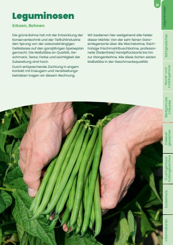 Die gr%u00fcne Bohne hat mit der Entwicklung der Konserventechnik und der Tiefk%u00fchlindustrie den Sprung von der saisonabh%u00e4ngigen Delikatesse auf den ganzj%u00e4hrigen Speiseplan gemacht. Die Ma%u00dfst%u00e4be an Qualit%u00e4t, Geschmack, Textur, Farbe und Leichtigkeit der Zubereitung sind hoch.Durch entsprechende Z%u00fcchtung in engem Kontakt mit Erzeugern und Verarbeitungsbetrieben tragen wir diesem Rechnung. Wir bedienen hier weitgehend alle Felder dieser M%u00e4rkte: Von der sehr feinen Ganzeinlegersorte %u00fcber die Wachsbohne, flachh%u00fclsige Frischmarktbuschbohne, professionelle (fadenfreie) Handpfl%u00fccksorte bis hin zur Stangenbohne. Alle diese Sorten setzen Ma%u00dfst%u00e4be in der Geschmacksqualit%u00e4t.LeguminosenErbsen, Bohnen Leguminosen Kohlgew%u00e4chse Wurzel- und Knollengem%u00fcse Blattgem%u00fcse Chicor%u00e9e Zwiebel- gew%u00e4chse Fruchtgem%u00fcse K%u00fcrbisgew%u00e4chse Zuckermais Informationen21