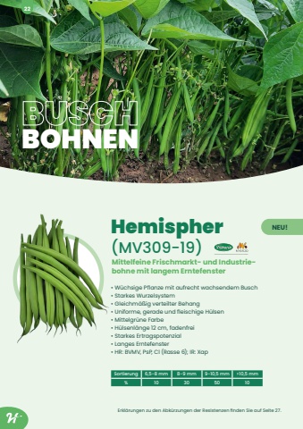 Erkl%u00e4rungen zu den Abk%u00fcrzungen der Resistenzen finden Sie auf Seite 27.BUSCH BOHNENHemispher (MV309-19)%u2022 W%u00fcchsige Pflanze mit aufrecht wachsendem Busch%u2022 Starkes Wurzelsystem%u2022 Gleichm%u00e4%u00dfig verteilter Behang%u2022 Uniforme, gerade und fleischige H%u00fclsen%u2022 Mittelgr%u00fcne Farbe%u2022 H%u00fclsenl%u00e4nge 12 cm, fadenfrei%u2022 Starkes Ertragspotenzial%u2022 Langes Erntefenster%u2022 HR: BVMV, PsP, Cl (Rasse 6); IR: XapMittelfeine Frischmarkt- und Industriebohne mit langem ErntefensterNEU!Sortierung 6,5-8 mm 8-9 mm 9-10,5 mm >10,5 mm% 10 30 50 1022