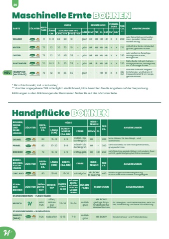 Maschinelle Ernte BOHNENHandpfl%u00fccke BOHNENSORTE Z%u00dcCHTER REIFETAGEH%u00dcLSE RESISTENZEN VERWENDUNG TKG CA. **ANMERKUNGEN L%u00c4NGE CMDURCHMESSER IN %FARBE BCMV PSP CL XAP FM* IND.*6,5-8 8-9 9-10,5 >10,5WALKER 71 11-12 60 30 10 - gr%u00fcn HR HR HR HR X X 200sehr feine Bohne mit uniformen, geraden H%u00fclsen und hohem ErtragKRITER 72 12 20 70 10 - gr%u00fcn HR HR HR HR X X 170 mittelfr%u00fche Sorte mit dunkelgr%u00fcnen, geraden H%u00fclsenDEEZER 73 12 20 45 35 - gr%u00fcn HR HR HR HR X X 230sehr uniforme, fleischige mittelgr%u00fcne H%u00fclsen, ertragsstarkSANTANDER 70 11-12 5 20 75 - gr%u00fcn HR IR HR HR X X 220fr%u00fche Sorte mit sehr hohem Ertragspotenzial, mittelgr%u00fcne, ca. 11 cm lange H%u00fclsenHEMISPHER (MV309-19) 72 12 10 35 55 - gr%u00fcn - HR IR X X ca. 150robuste Sorte mit langem Erntefenster und hohem Ertragspotenzial, 12 cm lange, gerade H%u00fclsen* FM = Frischmarkt; Ind. = Industrie /** das hier angegebene TKG ist lediglich ein Richtwert, bitte beachten Sie die Angaben auf der Verpackung.Erkl%u00e4rungen zu den Abk%u00fcrzungen der Resistenzen finden Sie auf der n%u00e4chsten Seite.NEUBOHNEN, GR%u00dcNE UND GELBE H%u00dcLSENZ%u00dcCHTERREIFETAGE CA.H%u00dcLSE RESISTENZENTKG CA. ANMERKUNGENL%u00c4NGE (CM)DURCHMESSER (CA. MM)FARBE BCMV CLDELINEL 83 15-18 8-9 mittel- bis dunkelgr%u00fcn HR - 300 feine H%u00fclsen, f%u00fcr den Haupt- und Sp%u00e4tanbauPRIMEL 80 17-20 8-9 mittel- bis dunkelgr%u00fcn HR - 300 sehr standfest, f%u00fcr den Ganzjahresanbau, gruppierte ErnteROCDOR 79 16-18 8-9 kr%u00e4ftig gelb HR HR 260 sehr fleischig, gerade H%u00fclsen mit rundem Querschnitt; guter Aufgang bei fr%u00fcher AussaatBUSCHBOHNEN, FLACHH%u00dcLSIGZ%u00dcCHTERREIFETAGE CA.L%u00c4NGE (CM)BREITE (CA. MM) FARBE RESISTENZENTKG CA. ANMERKUNGENCHICAGO 80 15-16 15-20 mittelgr%u00fcn HR: BCMV IR: Xap; Psp 440 flachh%u00fclsige Sortimentserg%u00e4nzung, auch f%u00fcr die maschinelle Ernte geeignetSTANGENBOHNENZ%u00dcCHTERFR%u00dcHZEITIGKEITWUCHSTYPH%u00dcLSENL%u00c4NGE IN CMH%u00dcLSENBREITE/H%u00dcLSENDURCHMESSER IN MMH%u00dcLSENFARBE RESISTENZEN ANMERKUNGENSTANGENBOHNEN %u2013 FLACHH%u00dcLSIGMUSICA sehr fr%u00fchoffen, H%u00fclsen gut sichtbar22-26 19-24 mittel,gr%u00fcnHR: BCMV geringe Empfindlichkeit f%u00fcr Wasserfleckenf%u00fcr Unterglas- und Freilandanbau; sehr hoher, fr%u00fcher Ertrag und hohe Pfl%u00fcckleistungSTANGENBOHNEN %u2013 RUNDH%u00dcLSIGEMERITE (INRA) fr%u00fch halboffen 16-18 7-9 mittel,gr%u00fcn HR: BCMV Gew%u00e4chshaus- und Freilandanbau26