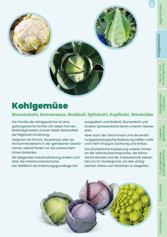 Die Familie der Kohlgew%u00e4chse ist eine gattungsreiche Familie mit vielen Formen, Marktsegmenten und ein fester Bestandteil der t%u00e4glichen Ern%u00e4hrung. Vergoren als Kimchi, Sauerkraut oder als Feinschmeckerkohl in der gehobenen Gastronomie, %u00fcberall finden wir die unterschiedlichen Kohlarten. Mit steigender Industrialisierung %u00e4ndern sich aber die Verbraucherw%u00fcnsche. Der Wei%u00dfkohl als Ern%u00e4hrungsgrundlage hat ausgedient und Brokkoli, Blumenkohl und andere Sprossenkohle zieren unseren Speiseplan. Aber auch der Geschmack und die ern%u00e4hrungsphysiologische Bedeutung halten mehr und mehr Einzug in Z%u00fcchtung und Anbau. Die z%u00fcchterische Anpassung unserer Sorten an die Verbraucheranspr%u00fcche, der klimatische Wandel und die Anbautechnik stehen bei uns im Vordergrund, um den erfolgreichen Anbau von Kohlarten zu begleiten.Kohlgem%u00fcseBlumenkohl, Romanesco, Brokkoli, Spitzkohl, Kopfkohl, Steckr%u00fcbeLeguminosen Kohlgew%u00e4chse Wurzel- und Knollengem%u00fcse Blattgem%u00fcse Chicor%u00e9e Zwiebel- gew%u00e4chse Fruchtgem%u00fcse K%u00fcrbisgew%u00e4chse Zuckermais Informationen31
