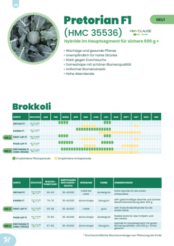 Pretorian F1 (HMC 35536)%u2022 W%u00fcchsige und gesunde Pflanze%u2022 Unempfindlich f%u00fcr hohle Str%u00fcnke%u2022 Stark gegen Durchwuchs%u2022 Domeshape mit sch%u00f6ner Blumenqualit%u00e4t%u2022 Uniformer Blumenansatz%u2022 Hohe AbernterateHybride im Hauptsegment f%u00fcr sichere 500 g +NEU!SORTE Z%u00dcCHTER WACHSTUMSTAGE1)EMPFOHLENE BESTANDESDICHTEW%u00d6LBUNG FARBE ANMERKUNGENSIRTAKI F1 60-63 35-40.000 mittel bis stark dunkelgr%u00fcn fr%u00fche Hybride f%u00fcr die ersten Anbaus%u00e4tzeKANGA F1 70-75 35-40.000 dome shape blaugr%u00fcn sehr gleichm%u00e4%u00dfige Abernte und sichere Gewichtsentwicklung %u00fcber 500 gFIRST LAP F1 65-68 35-40.000 mittel gr%u00fcn sehr fr%u00fche Brokkolihybride f%u00fcr die ersten S%u00e4tzePHAR LAP F1 70-80 35-40.000 dome shape dunkelgr%u00fcn flexible Sorte f%u00fcr das Fr%u00fchjahr und den HerbstPRETORIAN F1 (HMC 35536) 67-85 35-40.000 dome shape blaugr%u00fcnHybride im Hauptsegment mit guten Blumenqualit%u00e4ten und 500 g + Erntegewicht1) Durchschnittliche Wachstumstage von Pflanzung bis ErnteEmpfohlene Pflanzperiode Empfohlene ErnteperiodeBrokkoliSORTE Z%u00dcCHTER JAN FEB M%u00c4RZ APR MAI JUNI JULI AUG SEPT OKT NOV DEZSIRTAKI F1KANGA F1FIRST LAP F1PHAR LAP F1PRETORIAN F1 (HMC 35536)NEUNEUNEUNEU40