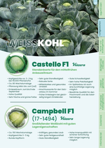 WEISSKOHLCastello F1%u2022 Kopfgewichte ca. 2%u2006-%u20063 kg bei 40.000 Pflanzen/ha%u2022 Ca. 80 Wachstumstage%u2022 Pflanzung M%u00e4rz bis Juni (Juli)%u2022 Erntezeitraum Juni bis Ende September%u2022 Hohe Qualit%u00e4t%u2022 Sehr frische und gr%u00fcne Farbe%u2022 Sehr gute Standfestigkeit%u2022 Robuste Sorte%u2022 Mittelstarkes und gesundes Umblatt%u2022 Anschlusssorte f%u00fcr den Satzanbau im Sommer%u2022 Fr%u00fcher Erntebeginn bei gleichzeitig langem Erntefenster%u2022 Gute Schossfestigkeit%u2022 Sehr hohe Platzfestigkeit%u2022 Im Sp%u00e4tanbau ist auch eine kurzfristige Lagerung m%u00f6glich%u2022 Bew%u00e4hrte Qualit%u00e4t f%u00fcr den Frischmarkt und die SalatherstellungStandardsorte f%u00fcr den mittelfr%u00fchen AnbauzeitraumCampbell F1 (17-1494)%u2022 Ca. 150 Wachstumstage%u2022 Kopfgewichte 3%u2006-%u20065 kg%u2022 Runde Kopfform%u2022 Kr%u00e4ftiges, gesundes Laub%u2022 Sehr gute Feldgesundheit%u2022 Gute Standfestigkeit%u2022 Hohe Innenqualit%u00e4t mit sch%u00f6ner Schichtung%u2022 Sehr lange Lagerung m%u00f6glichGro%u00dffallender Wei%u00dfkohl mit guten LagereigenschaftenLeguminosen Kohlgew%u00e4chse Wurzel- und Knollengem%u00fcse Blattgem%u00fcse Chicor%u00e9e Zwiebel- gew%u00e4chse Fruchtgem%u00fcse K%u00fcrbisgew%u00e4chse Zuckermais Informationen45