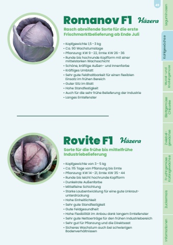 Romanov F1%u2022 Kopfgewichte 1,5%u2006-%u20063 kg%u2022 Ca. 90 Wachstumstage%u2022 Pflanzung: KW 9%u2006-%u200622, Ernte: KW 26%u2006-%u200636%u2022 Runde bis hochrunde Kopfform mit einer mittelstarken Wachsschicht%u2022 Sch%u00f6ne, kr%u00e4ftige Au%u00dfen- und Innenfarbe%u2022 Kr%u00e4ftiges Umblatt%u2022 Sehr gute Feldhaltbarkeit f%u00fcr einen flexiblen Einsatz im fr%u00fchen Bereich%u2022 Guter Sitz im Blatt%u2022 Hohe Standfestigkeit%u2022 Auch f%u00fcr die sehr fr%u00fche Belieferung der Industrie%u2022 Langes ErntefensterRasch abreifende Sorte f%u00fcr die erste Frischmarktbelieferung ab Ende JuliRovite F1%u2022 Kopfgewichte von 3%u2006-%u20065 kg%u2022 Ca. 115 Tage von Pflanzung bis Ernte%u2022 Pflanzung: KW 14%u2006-%u200621, Ernte: KW 35%u2006-%u200644%u2022 Runde bis leicht hochrunde Kopfform%u2022 Dunkelrote Au%u00dfenfarbe%u2022 Mittelfeine Schichtung%u2022 Starke Laubentwicklung f%u00fcr eine gute Unkrautunterdr%u00fcckung%u2022 Hohe Einheitlichkeit%u2022 Sehr gute Standfestigkeit%u2022 Gute Feldgesundheit%u2022 Hohe Flexibilit%u00e4t im Anbau dank langem Erntefenster%u2022 Sehr gute Nettoertr%u00e4ge f%u00fcr den fr%u00fchen Industriebereich%u2022 Sehr gut f%u00fcr Pflanzung und die Direktsaat%u2022 Sicheres Wachstum auch bei schwierigen Bodenverh%u00e4ltnissenSorte f%u00fcr die fr%u00fche bis mittelfr%u00fcheIndustriebelieferungLeguminosen Kohlgew%u00e4chse Wurzel- und Knollengem%u00fcse Blattgem%u00fcse Chicor%u00e9e Zwiebel- gew%u00e4chse Fruchtgem%u00fcse K%u00fcrbisgew%u00e4chse Zuckermais Informationen49
