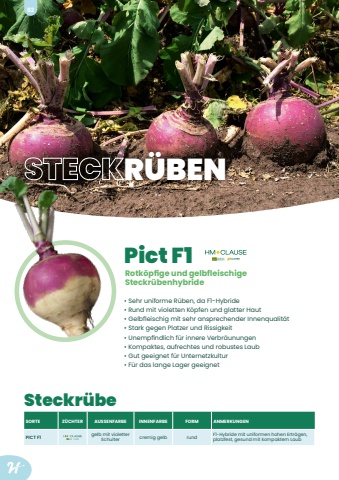 Pict F1%u2022 Sehr uniforme R%u00fcben, da F1-Hybride%u2022 Rund mit violetten K%u00f6pfen und glatter Haut%u2022 Gelbfleischig mit sehr ansprechender Innenqualit%u00e4t%u2022 Stark gegen Platzer und Rissigkeit%u2022 Unempfindlich f%u00fcr innere Verbr%u00e4unungen%u2022 Kompaktes, aufrechtes und robustes Laub%u2022 Gut geeignet f%u00fcr Unternetzkultur%u2022 F%u00fcr das lange Lager geeignetRotk%u00f6pfige und gelbfleischige Steckr%u00fcbenhybrideSTECKR%u00dcBENSORTE Z%u00dcCHTER AUSSENFARBE INNENFARBE FORM ANMERKUNGENPICT F1 gelb mit violetter Schulter cremig gelb rund F1-Hybride mit uniformen hohen Ertr%u00e4gen, platzfest, gesund mit kompaktem LaubSteckr%u00fcbe52