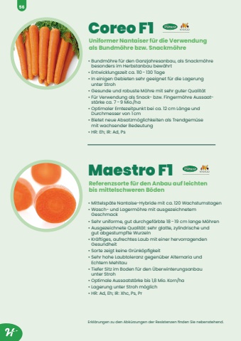 Coreo F1%u2022 Bundm%u00f6hre f%u00fcr den Ganzjahresanbau, als Snackm%u00f6hre besonders im Herbstanbau bew%u00e4hrt%u2022 Entwicklungszeit ca. 110 - 130 Tage%u2022 In einigen Gebieten sehr geeignet f%u00fcr die Lagerung unter Stroh%u2022 Gesunde und robuste M%u00f6hre mit sehr guter Qualit%u00e4t%u2022 F%u00fcr Verwendung als Snack- bzw. Fingerm%u00f6hre Aussaatst%u00e4rke ca. 7 - 9 Mio./ha%u2022 Optimaler Erntezeitpunkt bei ca. 12 cm L%u00e4nge und Durchmesser von 1 cm%u2022 Bietet neue Absatzm%u00f6glichkeiten als Trendgem%u00fcse mit wachsender Bedeutung%u2022 HR: Eh; IR: Ad, PsUniformer Nantaiser f%u00fcr die Verwendung als Bundm%u00f6hre bzw. Snackm%u00f6hreMaestro F1%u2022 Mittelsp%u00e4te Nantaise-Hybride mit ca. 120 Wachstumstagen%u2022 Wasch- und Lagerm%u00f6hre mit ausgezeichnetem Geschmack%u2022 Sehr uniforme, gut durchgef%u00e4rbte 18 - 19 cm lange M%u00f6hren%u2022 Ausgezeichnete Qualit%u00e4t: sehr glatte, zylindrische und gut abgestumpfte Wurzeln%u2022 Kr%u00e4ftiges, aufrechtes Laub mit einer hervorragenden Gesundheit%u2022 Sorte zeigt keine Gr%u00fcnk%u00f6pfigkeit%u2022 Sehr hohe Laubtoleranz gegen%u00fcber Alternaria und Echtem Mehltau%u2022 Tiefer Sitz im Boden f%u00fcr den %u00dcberwinterungsanbau unter Stroh%u2022 Optimale Aussaatst%u00e4rke bis 1,8 Mio. Korn/ha%u2022 Lagerung unter Stroh m%u00f6glich%u2022 HR: Ad, Eh; IR: Xhc, Ps, PrReferenzsorte f%u00fcr den Anbau auf leichten bis mittelschweren B%u00f6denErkl%u00e4rungen zu den Abk%u00fcrzungen der Resistenzen finden Sie nebenstehend.56