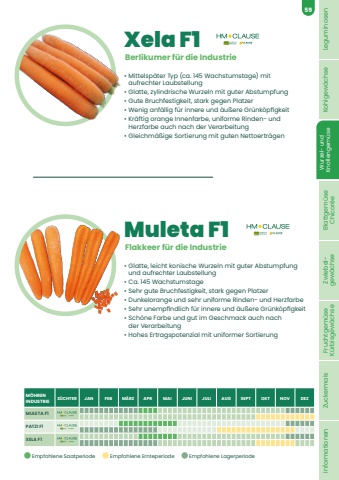 Empfohlene Saatperiode Empfohlene Ernteperiode Empfohlene LagerperiodeM%u00d6HREN INDUSTRIE Z%u00dcCHTER JAN FEB M%u00c4RZ APR MAI JUNI JULI AUG SEPT OKT NOV DEZMULETA F1PATZI F1XELA F1Muleta F1%u2022 Glatte, leicht konische Wurzeln mit guter Abstumpfung und aufrechter Laubstellung%u2022 Ca. 145 Wachstumstage%u2022 Sehr gute Bruchfestigkeit, stark gegen Platzer%u2022 Dunkelorange und sehr uniforme Rinden- und Herzfarbe%u2022 Sehr unempfindlich f%u00fcr innere und %u00e4u%u00dfere Gr%u00fcnk%u00f6pfigkeit%u2022 Sch%u00f6ne Farbe und gut im Geschmack auch nach der Verarbeitung%u2022 Hohes Ertragspotenzial mit uniformer SortierungFlakkeer f%u00fcr die IndustrieXela F1%u2022 Mittelsp%u00e4ter Typ (ca. 145 Wachstumstage) mit aufrechter Laubstellung%u2022 Glatte, zylindrische Wurzeln mit guter Abstumpfung%u2022 Gute Bruchfestigkeit, stark gegen Platzer%u2022 Wenig anf%u00e4llig f%u00fcr innere und %u00e4u%u00dfere Gr%u00fcnk%u00f6pfigkeit%u2022 Kr%u00e4ftig orange Innenfarbe, uniforme Rinden- und Herzfarbe auch nach der Verarbeitung%u2022 Gleichm%u00e4%u00dfige Sortierung mit guten Nettoertr%u00e4genBerlikumer f%u00fcr die IndustrieLeguminosen Kohlgew%u00e4chse Wurzel- und Knollengem%u00fcse Blattgem%u00fcse Chicor%u00e9e Zwiebel- gew%u00e4chse Fruchtgem%u00fcse K%u00fcrbisgew%u00e4chse Zuckermais Informationen59