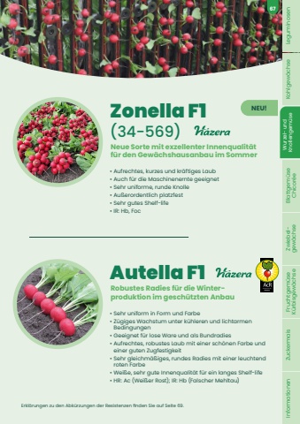 Autella F1%u2022 Sehr uniform in Form und Farbe%u2022 Z%u00fcgiges Wachstum unter k%u00fchleren und lichtarmen Bedingungen%u2022 Geeignet f%u00fcr lose Ware und als Bundradies%u2022 Aufrechtes, robustes Laub mit einer sch%u00f6nen Farbe und einer guten Zugfestigkeit%u2022 Sehr gleichm%u00e4%u00dfiges, rundes Radies mit einer leuchtend roten Farbe%u2022 Wei%u00dfe, sehr gute Innenqualit%u00e4t f%u00fcr ein langes Shelf-life%u2022 HR: Ac (Wei%u00dfer Rost); IR: Hb (Falscher Mehltau)Robustes Radies f%u00fcr die Winterproduktion im gesch%u00fctzten Anbau Powered byHazeraZonella F1 (34-569)%u2022 Aufrechtes, kurzes und kr%u00e4ftiges Laub%u2022 Auch f%u00fcr die Maschinenernte geeignet%u2022 Sehr uniforme, runde Knolle%u2022 Au%u00dferordentlich platzfest%u2022 Sehr gutes Shelf-life%u2022 IR: Hb, FocNeue Sorte mit exzellenter Innenqualit%u00e4t f%u00fcr den Gew%u00e4chshausanbau im SommerNEU!Erkl%u00e4rungen zu den Abk%u00fcrzungen der Resistenzen finden Sie auf Seite 69.Leguminosen Kohlgew%u00e4chse Wurzel- und Knollengem%u00fcse Blattgem%u00fcse Chicor%u00e9e Zwiebel- gew%u00e4chse Fruchtgem%u00fcse K%u00fcrbisgew%u00e4chse Zuckermais Informationen67