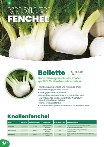 KNOLLEN FENCHELBellotto%u2022 Runde, bauchige, feste und reinwei%u00dfe Knolle%u2022 Gleichm%u00e4%u00dfig gro%u00df und schwer%u2022 Stark gegen braune R%u00e4nder%u2022 Kompaktes, dunkelgr%u00fcnes und aufrechtes Laub%u2022 Auf m%u00f6gliches starkes Innentrieb-Wachstum zum Erntezeitpunkt achten%u2022 Hohes Ertragspotenzial%u2022 Attraktive Marktpr%u00e4sentation auch als Baby-FenchelSorte mit ausgezeichneter Knollenqualit%u00e4t f%u00fcr den GanzjahresanbauSORTE Z%u00dcCHTER FR%u00dcHZEITIGKEIT ANBAUZEIT %u00d8 GEWICHT IN G ANMERKUNGENTAURO F1 XXXXX Ganzjahresanbau 450 sehr ansprechende und sichere Sorte f%u00fcr den GanzjahresanbauBELLOTTO F1 XXXX Ganzjahresanbau 450 bauchig, wei%u00dfe und glatte Knollen mit top Qualit%u00e4tVASARI F1 XXXX Fr%u00fchjahr und Herbst 450 glatte, wei%u00dfe Knolle mit sehr ansprechender FormKnollenfenchel72