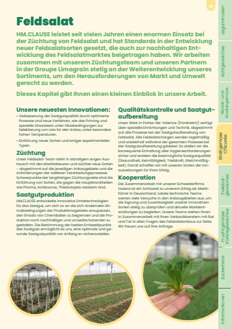 Unsere neuesten Innovationen:%u2022 Verbesserung der Saatgutqualit%u00e4t durch optimierte Prozesse und neue Verfahren, wie das Priming und spezielle Stresstests unter Hitzebedingungen zur Selektierung von Lots f%u00fcr den Anbau unter besonders hohen Temperaturen.%u2022 Einf%u00fchrung neuer Sorten und einiger experimenteller Typen.Z%u00fcchtungUnser Feldsalat-Team steht in st%u00e4ndigem engen Austausch mit den Marktakteuren und z%u00fcchtet neue Sorten - abgestimmt auf die jeweiligen Anbaugebiete und die Anforderungen der weiteren Verarbeitungsprozesse. Schwerpunkte der langfristigen Z%u00fcchtungsziele sind die Einf%u00fchrung von Sorten, die gegen die Hauptkrankheiten wie Phoma, Acidovorax, Thielaviopsis resistent sind.SaatgutproduktionHM.CLAUSE entwickelte innovative Erntetechnologien f%u00fcr das Saatgut, um sich so an die sich %u00e4ndernden Klimabedingungen der Produktionsgebiete anzupassen, den Einsatz von Chemikalien zu begrenzen und die Produktion noch nachhaltiger und umweltschonender zu gestalten. Die Bestimmung der besten Erntezeitpunkte des Saatguts erm%u00f6glicht es uns, eine optimale und gesunde Saatgutqualit%u00e4t von Anfang an sicherzustellen.Qualit%u00e4tskontrolle und SaatgutaufbereitungUnser Werk in Portes-l%u00e8s-Valence (Frankreich) verf%u00fcgt %u00fcber spezielle Einrichtungen und Technik, abgestimmt auf alle Prozesse bei der Saatgutaufbereitung von Feldsalat. Alle Feldsalatchargen werden regelm%u00e4%u00dfig und wiederholt w%u00e4hrend der gesamten Prozesse bei der Saatgutaufbereitung getestet. So stellen wir die konsequente Einhaltung aller Hygieneanforderungen sicher und erzielen die bestm%u00f6gliche Saatgutqualit%u00e4t (Gesundheit, Keimf%u00e4higkeit, Triebkraft, Gleichm%u00e4%u00dfigkeit). Damit schaffen wir mit unseren Sorten die Voraussetzungen f%u00fcr Ihren Erfolg.KooperationDie Zusammenarbeit mit unserer Schwesterfirma Hazera ist ein Schl%u00fcssel zu unserem Erfolg als Marktf%u00fchrer in Deutschland. Lokale technische Teams werten viele Versuche in den Anbaugebieten aus, um die Eignung und Zuverl%u00e4ssigkeit unserer innovativen Sorten stetig zu %u00fcberpr%u00fcfen und aktuelle Marktentwicklungen zu begleiten. Unsere Teams stehen Ihnen in Zusammenarbeit mit ihren Verkaufsberatern mit Rat und Tat in allen Fragen des Feldsalatanbaus zur Seite. Wir freuen uns auf Ihre Anfrage.FeldsalatHM.CLAUSE leistet seit vielen Jahren einen enormen Einsatz bei der Z%u00fcchtung von Feldsalat und hat Standards in der Entwicklung neuer Feldsalatsorten gesetzt, die auch zur nachhaltigen Entwicklung des Feldsalatmarktes beigetragen haben. Wir arbeiten zusammen mit unserem Z%u00fcchtungsteam und unseren Partnern in der Groupe Limagrain stetig an der Weiterentwicklung unseres Sortiments, um den Herausforderungen von Markt und Umwelt gerecht zu werden.Dieses Kapitel gibt Ihnen einen kleinen Einblick in unsere Arbeit.Leguminosen Kohlgew%u00e4chse Wurzel- und Knollengem%u00fcse Blattgem%u00fcse Chicor%u00e9e Zwiebel- gew%u00e4chse Fruchtgem%u00fcse K%u00fcrbisgew%u00e4chse Zuckermais Informationen75