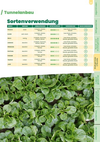 / TunnelanbauSORTE RIEFUNG ANBAUPERIODE HITZETOLERANZ VERWENDUNG MASCHINENERNTEPALACE stark Fr%u00fchjahr, Herbst, Winterlose Ware, Schalen, BeutelELIXIR sehr stark Fr%u00fchjahr, Herbst, Winterlose Ware, Schalen, BeutelGALA wenig Fr%u00fchjahr, Sommer, Herbst, Winterlose Ware, Schalen, Beutel, gestellte WareAUDACE deutlich Fr%u00fchjahr, Sommer, Herbst, Winterlose Ware, Schalen, Beutel, gestellte WarePRINCESS deutlich Fr%u00fchjahr, Herbst, Winterlose Ware, Schalen, Beutel, gestellte WareFESTIVAL deutlich Fr%u00fchjahr, Herbst, Winterlose Ware, Schalen, Beutel, gestellte WarePARADE deutlich Fr%u00fchjahr, Herbst, Winterlose Ware, Schalen, Beutel, gestellte WareTROPHY mittel Fr%u00fchjahr, Herbst, Winterlose Ware, Schalen, Beutel, gestellte WareJAZZ deutlich Fr%u00fchjahr, Herbst, Winterlose Ware, Schalen, Beutel, gestellte WareSortenverwendungLeguminosen Kohlgew%u00e4chse Wurzel- und Knollengem%u00fcse Blattgem%u00fcse Chicor%u00e9e Zwiebel- gew%u00e4chse Fruchtgem%u00fcse K%u00fcrbisgew%u00e4chse Zuckermais Informationen77