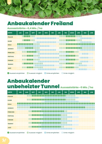 Anbaukalender FreilandAussaatst%u00e4rke ~6,4 Mio. / haSORTE JULI AUG SEPT OKT NOV DEZ JAN FEB M%u00c4RZ APR MAI JUNIPALACEELIXIRGALAAUDACEPRINCESSFESTIVALPARADETROPHYJAZZAussaat empfohlen Aussaat m%u00f6glich Ernte empfohlen Ernte m%u00f6glichSORTE JULI AUG SEPT OKT NOV DEZ JAN FEB M%u00c4RZ APR MAI JUNIPALACEELIXIRGALAAUDACEPRINCESSFESTIVALPARADETROPHYJAZZAussaat empfohlen Aussaat m%u00f6glich Ernte empfohlen Ernte m%u00f6glichAnbaukalender unbeheizter Tunnel Aussaatst%u00e4rke ~5 Mio. / ha78