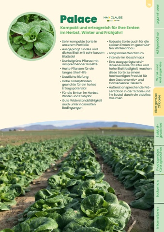 Palace%u2022 Sehr kompakte Sorte in unserem Portfolio%u2022 Ausgepr%u00e4gt rundes und dickes Blatt mit sehr kurzem Blattstiel%u2022 Dunkelgr%u00fcne Pflanze mit ansprechender Rosette%u2022 Harte Pflanzen f%u00fcr ein langes Shelf-life%u2022 Deutliche Riefung%u2022 Hohe Einzelpflanzengewichte f%u00fcr ein hohes Ertragspotenzial%u2022 F%u00fcr die Ernten im Herbst, Winter und Fr%u00fchjahr%u2022 Gute Widerstandsf%u00e4higkeit auch unter nasskalten Bedingungen%u2022 Robuste Sorte auch f%u00fcr die sp%u00e4ten Ernten im gesch%u00fctzten Winteranbau%u2022 Langsames Wachstum%u2022 Intensiv im Geschmack%u2022 Eine ausgepr%u00e4gte dreidimensionale Struktur und hohe Blattfestigkeit machen diese Sorte zu einem hochwertigen Produkt f%u00fcr den Gastronomie- und Convenience-Bereich%u2022 %u00c4u%u00dferst ansprechende Pr%u00e4sentation in der Schale und im Beutel durch ein stabiles VolumenKompakt und ertragreich f%u00fcr Ihre Ernten im Herbst, Winter und Fr%u00fchjahr!Leguminosen Kohlgew%u00e4chse Wurzel- und Knollengem%u00fcse Blattgem%u00fcse Chicor%u00e9e Zwiebel- gew%u00e4chse Fruchtgem%u00fcse K%u00fcrbisgew%u00e4chse Zuckermais Informationen79