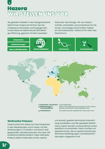 HazeraWIR STELLEN UNS VORAls globaler Anbieter in der Saatgutindustrie liefert Ihnen Hazera als Partner des Gem%u00fcsebaus Fachwissen und Engagement. Unsere Basis ist dabei die jahrzehntelange Erfahrung, gepaart mit dem neuesten Stand der Technologie. Wir von Hazera z%u00fcchten, entwickeln und produzieren f%u00fcr Sie Sorten und Saatgut einer breiten Palette an Gem%u00fcsekulturen. Hazera ist Ihr Keim des Wachstums.2 Stammsitze11 NiederlassungenMehr als 900 Mitarbeiter Aktiv in 130 M%u00e4rkten 4 F&E Zentren 8 ZuchtstationenWeltweite Pr%u00e4senzHazera st%u00fctzt sich dabei auf zwei Hauptsitze in den Niederlanden und in Israel, mit Niederlassungen in 11 L%u00e4ndern und einem weit gespannten Vertriebsnetzwerk, das %u00fcber 100 zus%u00e4tzliche M%u00e4rkte bedient. Diese weltweite Pr%u00e4senz stellt Kundenn%u00e4he sicher, welche uns erlaubt, gezielte technische Unterst%u00fctzung anzubieten und die speziellen Bed%u00fcrfnisse unserer Kunden vorauszuahnen sowie spezifisch zu entwickeln. Hierzu z%u00fcchten wir spezielle Sorten, die an bestimmte Klimate, Wachstumsbedingungen und Marktanforderungen angepasst sind.Stammsitze + F&E Zentren: Israel, NiederlandeNiederlassungen + Mexiko, USA, Gro%u00dfbritannien, Deutschland, Polen Ukraine,Versuchsstationen: Spanien, Griechenland, T%u00fcrkei, S%u00fcdafrika, ChinaZuchtstationen: USA, Mexiko, Spanien, Niederlande, T%u00fcrkei, Israel, China8
