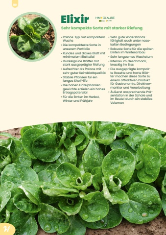 Elixir%u2022 Palace-Typ mit kompaktem Wuchs%u2022 Die kompakteste Sorte in unserem Portfolio%u2022 Rundes und dickes Blatt mit minimalem Blattstiel%u2022 Dunkelgr%u00fcne Bl%u00e4tter mit stark ausgepr%u00e4gter Riefung%u2022 Aufrechter als Palace mit sehr guter Keimblattqualit%u00e4t%u2022 Stabile Pflanzen f%u00fcr ein langes Shelf-life%u2022 Die hohen Einzelpflanzengewichte erzielen ein hohes Ertragspotenzial%u2022 F%u00fcr die Ernten im Herbst, Winter und Fr%u00fchjahr%u2022 Sehr gute Widerstands- f%u00e4higkeit auch unter nasskalten Bedingungen%u2022 Robuste Sorte f%u00fcr die sp%u00e4ten Ernten im Winteranbau%u2022 Sehr langsames Wachstum%u2022 Intensiv im Geschmack, knackig im Biss%u2022 Die ausgepr%u00e4gte kompakte Rosette und harte Bl%u00e4tter machen diese Sorte zu einem attraktiven Produkt f%u00fcr Gastronomie, Direktvermarkter und Verarbeitung%u2022 %u00c4u%u00dferst ansprechende Pr%u00e4sentation in der Schale und im Beutel durch ein stabiles VolumenSehr kompakte Sorte mit starker Riefung80