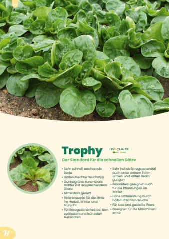 Trophy%u2022 Sehr schnell wachsende Sorte%u2022 Halbaufrechter Wuchstyp%u2022 Dunkelgr%u00fcne, rund-ovale Bl%u00e4tter mit ansprechendem Glanz%u2022 Mittelstark gerieft%u2022 Referenzsorte f%u00fcr die Ernte im Herbst, Winter und Fr%u00fchjahr%u2022 F%u00fcr Ertragssicherheit bei den sp%u00e4testen und fr%u00fchesten Aussaaten%u2022 Sehr hohes Ertragspotenzial auch unter extrem lichtarmen und kalten Bedingungen%u2022 Besonders geeignet auch f%u00fcr die Pflanzungen im Winter%u2022 Hohe Ernteleistung durch halbaufrechten Wuchs%u2022 F%u00fcr lose und gestellte Ware%u2022 Geeignet f%u00fcr die MaschinenernteDer Standard f%u00fcr die schnellen S%u00e4tze86