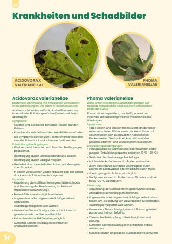 Acidovorax valerianellaeBakterielle Erkrankung mit erheblichen wirtschaftlichen Auswirkungen, vor allem in FreilandkulturenAcidovorax ist wirtsspezifisch, das hei%u00dft es wird nur innerhalb der Baldriangew%u00e4chse (Valerianoideae) %u00fcbertragen.Symptome%u2022 Feuchte und dunkle bis schwarze Flecken auf den Bl%u00e4ttern.%u2022 Kann bereits sehr fr%u00fch auf den Keimbl%u00e4ttern auftreten.%u2022 Die Symptome k%u00f6nnen zum Teil mit Phoma valerianellae oder Rhizoctonia solani verwechselt werden.Entwicklungsbedingungen%u2022 Wird vermehrt bei oder nach feuchten Bedingungen beobachtet.%u2022 %u00dcbertragung durch Ernter%u00fcckst%u00e4nde und Boden.%u2022 %u00dcbertragung durch Saatgut m%u00f6glich.%u2022 Gef%u00f6rdert durch wiederholten Anbau auf dem gleichen Standort.%u2022 In einem verseuchten Boden reduziert sich der Befallsdruck erst ab 9 Monaten Anbaupause.Kontrolle%u2022 Regulierung der Luftfeuchte im gesch%u00fctzten Anbau und Steuerung der Bew%u00e4sserung im Freiland (trockenere Kulturf%u00fchrung).%u2022 Ernteabf%u00e4lle soweit m%u00f6glich entfernen.%u2022 Abgeerntete oder ungeerntete Schl%u00e4ge zeitnah einarbeiten.%u2022 Fruchtfolge m%u00f6glichst weit w%u00e4hlen.%u2022 Verwenden Sie nur Saatgut, das auf Acidovorax getestet wurde und frei von Befall ist.%u2022 Keine chemische Bek%u00e4mpfung m%u00f6glich.%u2022 Aufrechte Sorten bevorzugen in kritischen Anbauzeitr%u00e4umen.Phoma valerianellaeDiese unter vielf%u00e4ltigen Kulturbedingungen auftretende Pilzkrankheit f%u00fchrt zu einem erheblichen Befall der KulturPhoma ist wirtsspezifisch, das hei%u00dft, er wird nur innerhalb der Baldriangew%u00e4chse (Valerianoideae) %u00fcbertragen.Symptome%u2022 Rote Flecken und Streifen treten zuerst an der Unterseite der unteren Bl%u00e4tter sowie der Keimbl%u00e4tter auf. Sie entwickeln sich zu schwarzen nekrotischen Flecken weiter. Die Krankheit kann sich auf das gesamte Stamm- und Wurzelsystem ausbreiten.Entwicklungsbedingungen%u2022 Vorzugsweise bei warmen und/oder feuchten Bedingungen (Entwicklungsspanne zwischen 10 %u00b0C - 30 %u00b0C).%u2022 Gef%u00f6rdert durch eine enge Fruchtfolge.%u2022 Auf Ernter%u00fcckst%u00e4nden und im Boden vorhanden.%u2022 Leicht von Pflanze zu Pflanze %u00fcbertragbar durch Sporen im Spritzwasser oder im Boden durch Myzel.%u2022 %u00dcbertragung durch Saatgut m%u00f6glich.%u2022 Die Sporen k%u00f6nnen im Boden bis zu 20 Jahre und bei bis zu -20 %u00b0C %u00fcberdauern.Steuerung%u2022 Regulierung der Luftfeuchte im gesch%u00fctzten Anbau.%u2022 Ernteabf%u00e4lle soweit m%u00f6glich entfernen.%u2022 Abgeerntete oder ungeerntete Schl%u00e4ge zeitnah einarbeiten, um die Bildung von Dauersporen zu vermeiden.%u2022 Fruchtfolge m%u00f6glichst weit w%u00e4hlen.%u2022 Verwenden Sie nur Saatgut, das auf Phoma getestet wurde und frei von Befall ist.%u2022 Chemische Bek%u00e4mpfung mittels Fungiziden und Beizung.%u2022 Aufrechte Sorten bevorzugen in kritischen Anbauzeitr%u00e4umen.%u2022 Kulturzeit durch angepasste Aussaatdichte verk%u00fcrzen.Krankheiten und SchadbilderACIDOVORAX VALERIANELLAEPHOMA VALERIANELLAE88
