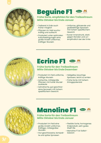 Beguine F1%u2022 Treiberei in Erde auch fr%u00fcher m%u00f6glich%u2022 Pflanzen im Feld wuchskr%u00e4ftig und aufrecht%u2022 Produziert unter optimalen Kulturbedingungen eine gro%u00dfe Anzahl uniformer, kr%u00e4ftiger Wurzeln%u2022 Uniforme, gl%u00e4nzende und gro%u00dfbl%u00e4ttrige Sprossen mit hohem spezifischem Gewicht%u2022 Kurzer Innenstrunk, stark gegen Randen und unempfindlich bei der ErnteFr%u00fche Sorte, empfohlen f%u00fcr den Treibzeitraum Mitte Oktober bis Ende JanuarEcrine F1%u2022 Produziert im Feld uniforme, kr%u00e4ftige Wurzeln%u2022 Aufrechte, mittelgro%u00dfe Pflanzen mit hoher Wurzelausbeute%u2022 Zylindrische, gut geschlossene Sprossen mit hohem spezifischem Gewicht%u2022 Hellgelbe, bauchige Sprossen, leicht zu ernten%u2022 Fr%u00fche Sorte mit hohem ErtragspotenzialFr%u00fche Sorte f%u00fcr den Treibzeitraum Mitte Oktober bis Ende DezemberManoline F1%u2022 Produziert im Feld eine gro%u00dfe Anzahl uniformer, kr%u00e4ftiger, mittelgro%u00dfer Wurzeln%u2022 Gut geschlossene, kompakte und spitze Sprossen%u2022 Flexible Sorte, homogenes Endprodukt, sehr gutes Shelf-life%u2022 Manoline F1 ist SafaritolerantFr%u00fche Sorte f%u00fcr den Treibzeitraum Mitte Oktober bis Ende Januar92